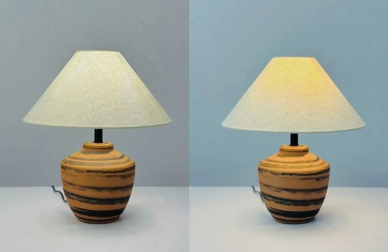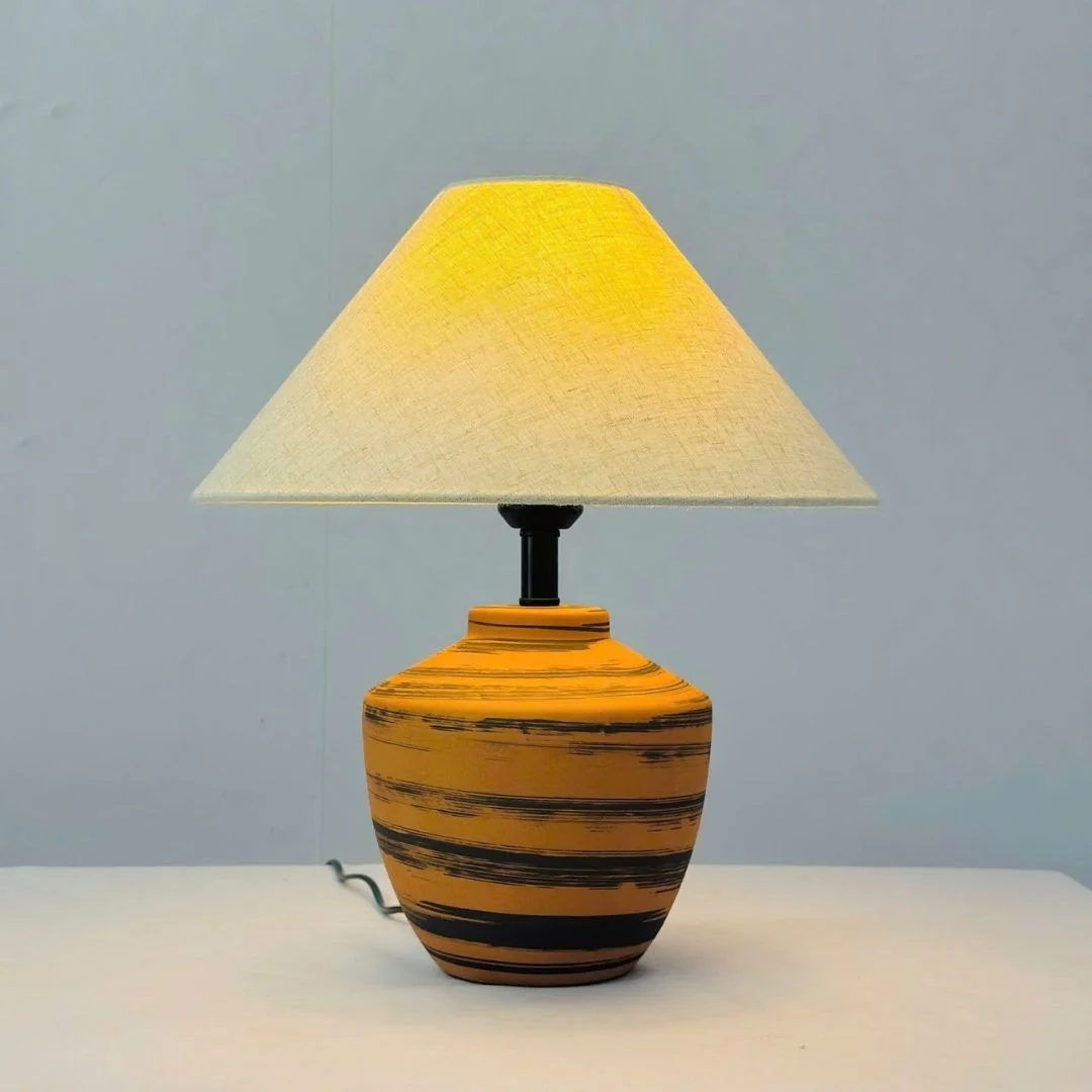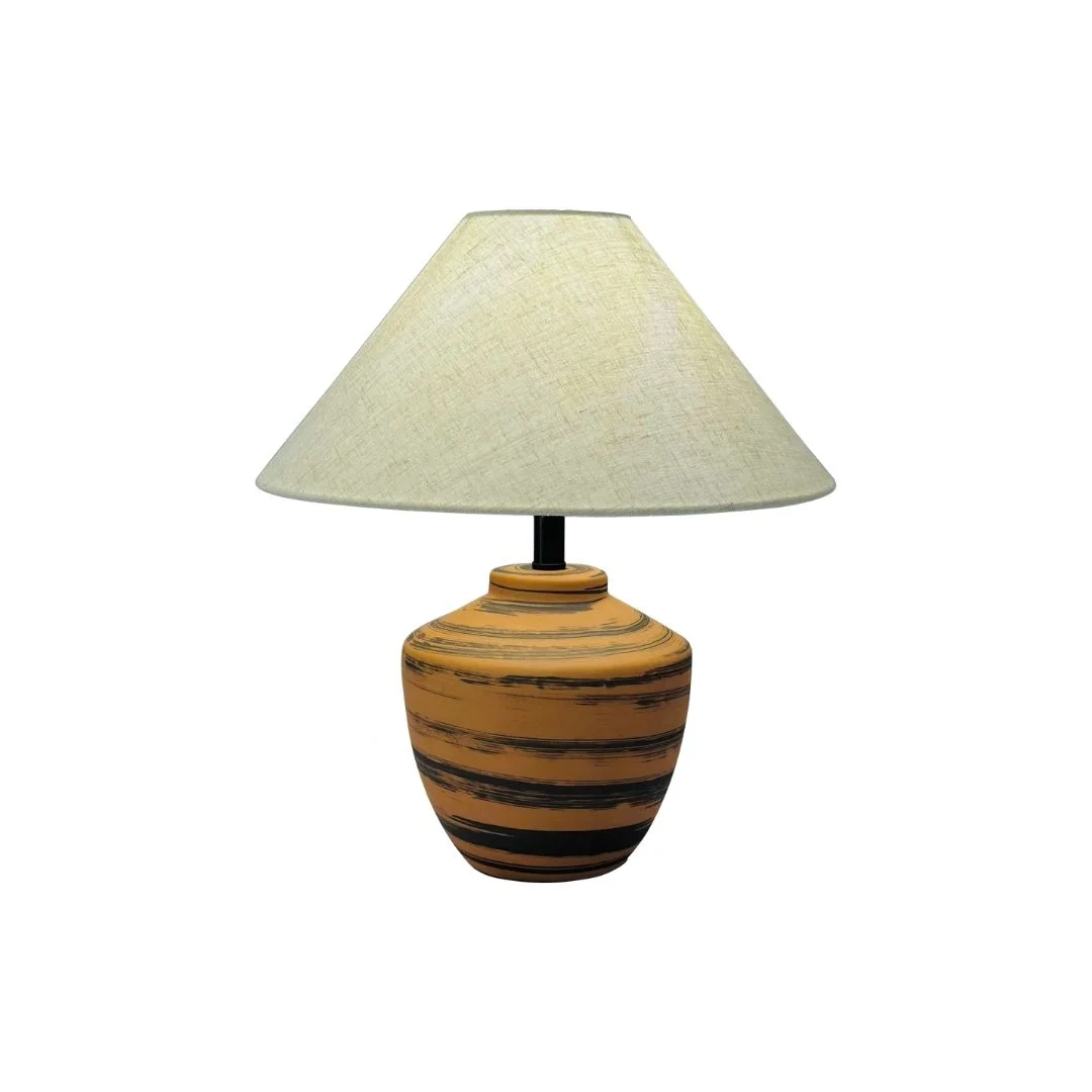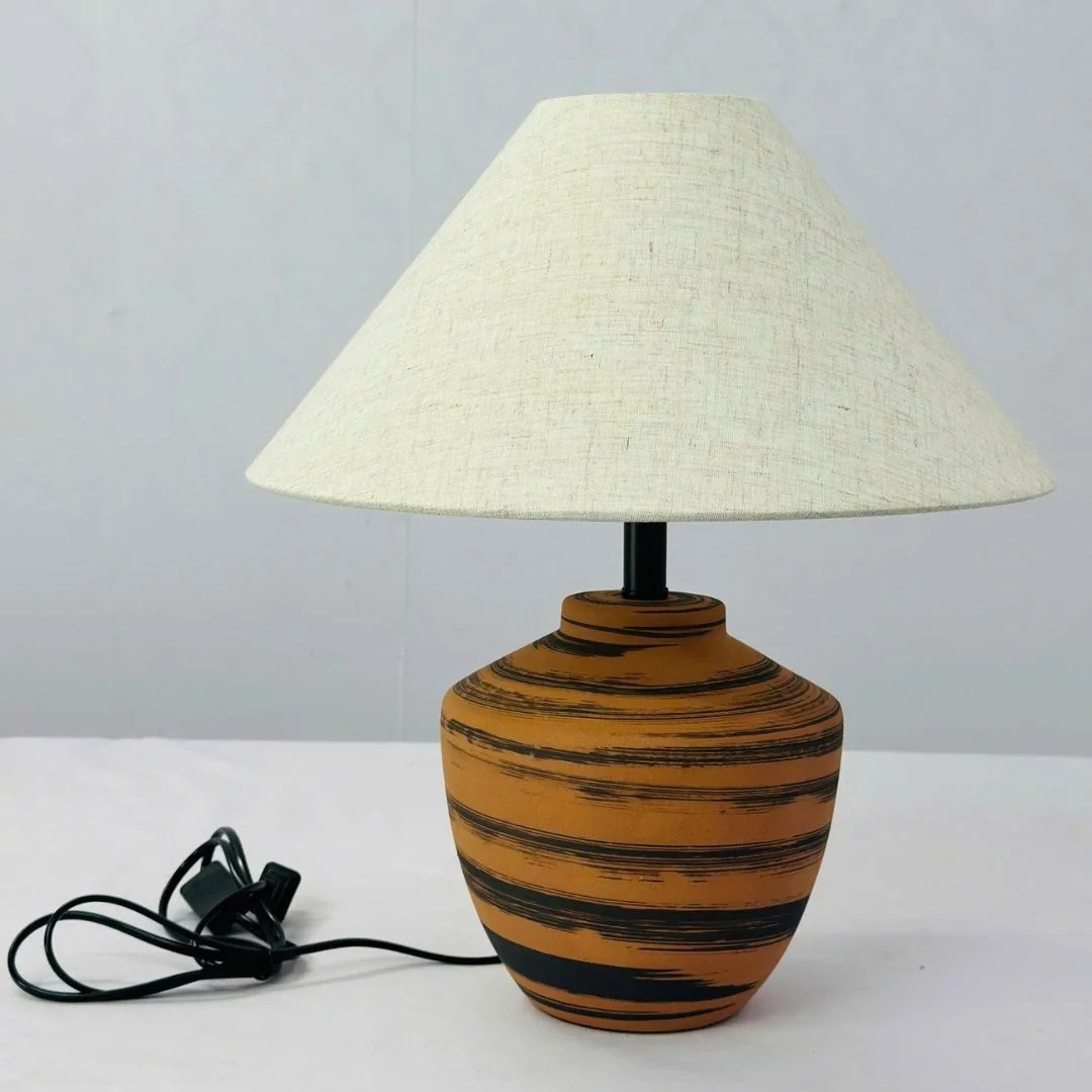 Đèn Bàn DB95 sở hữu kiểu dáng thân gốm dáng chum tròn quen thuộc, tạo cảm giác thân thuộc như những vật dụng gốm truyền thống. Bề mặt gốm màu nâu cam ấm, được nhấn bằng các đường vân kẻ ngang giúp tổng thể vừa mộc mạc vừa có chiều sâu thẩm mỹ. Phía trên là chụp vải bố hình nón rộng, giúp ánh sáng tỏa đều và bao trùm không gian một cách nhẹ nhàng.