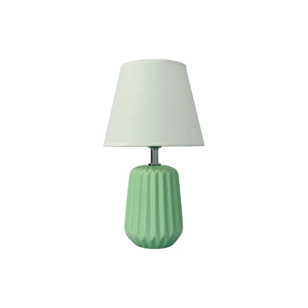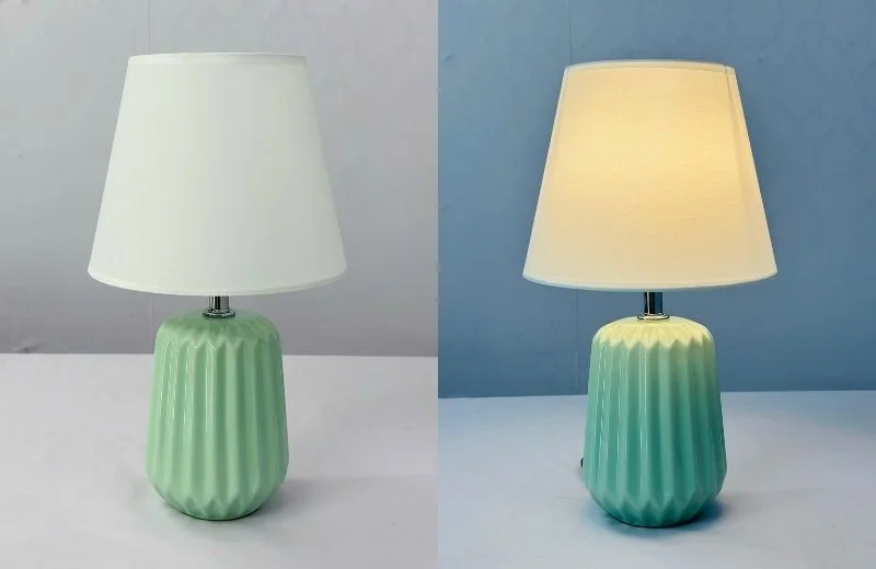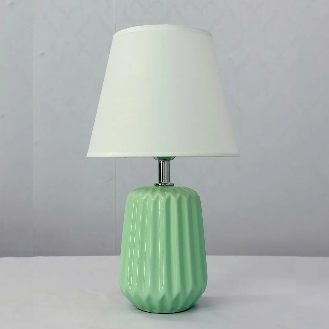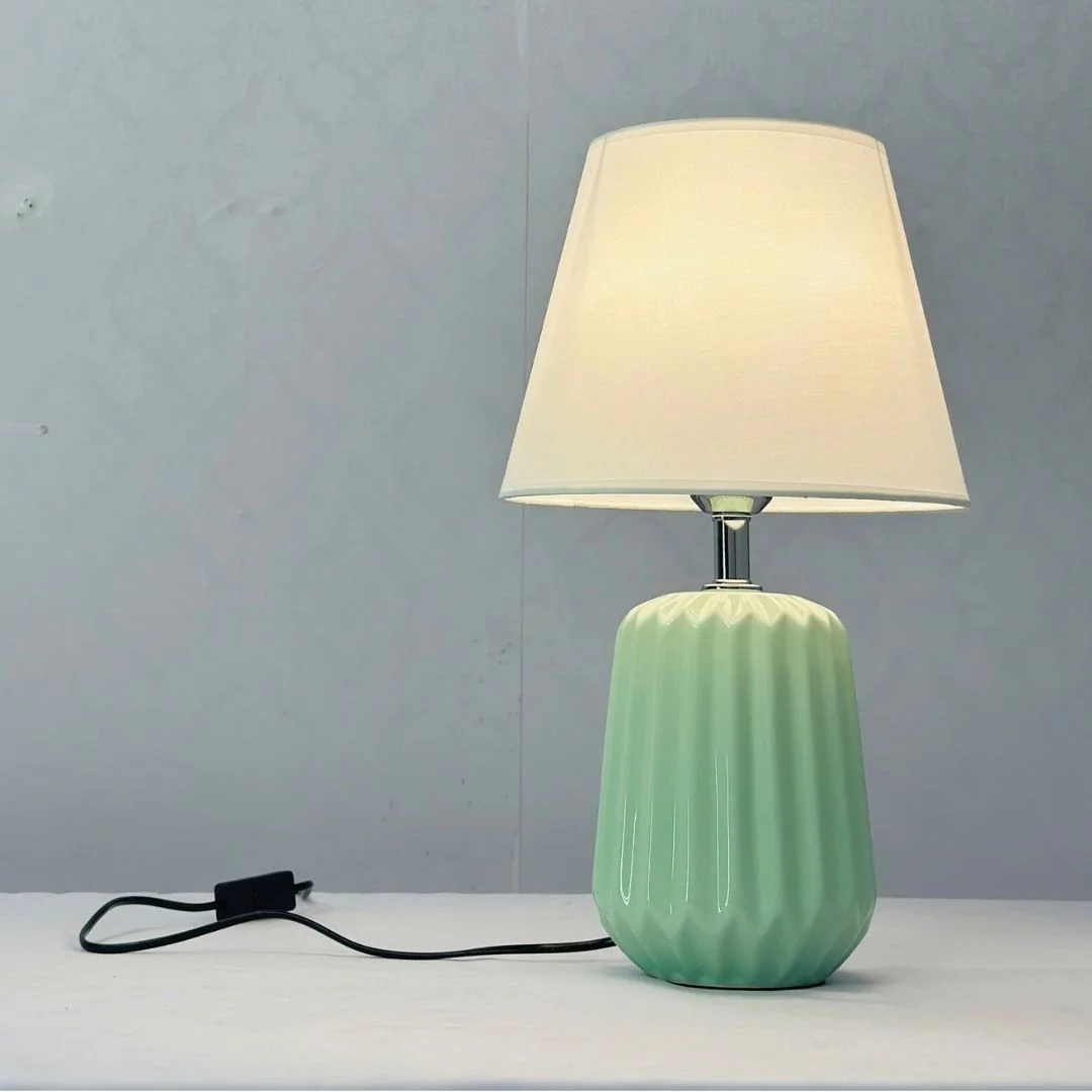 Đèn Bàn DB99 sở hữu phần thân gốm dáng trụ bo tròn mềm mại, bề mặt tạo rãnh đứng đều nhau tạo hiệu ứng ánh sáng và bóng đổ rất đẹp khi bật đèn. Tông màu xanh ngọc pastel trang nhã mang lại cảm giác mát mắt, phù hợp với các không gian trẻ trung, hiện đại hoặc phong cách tối giản.