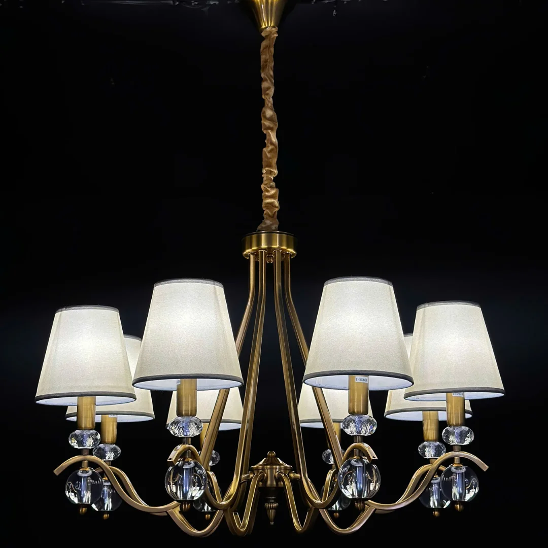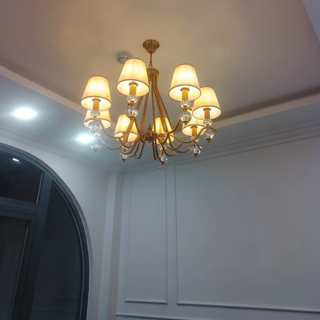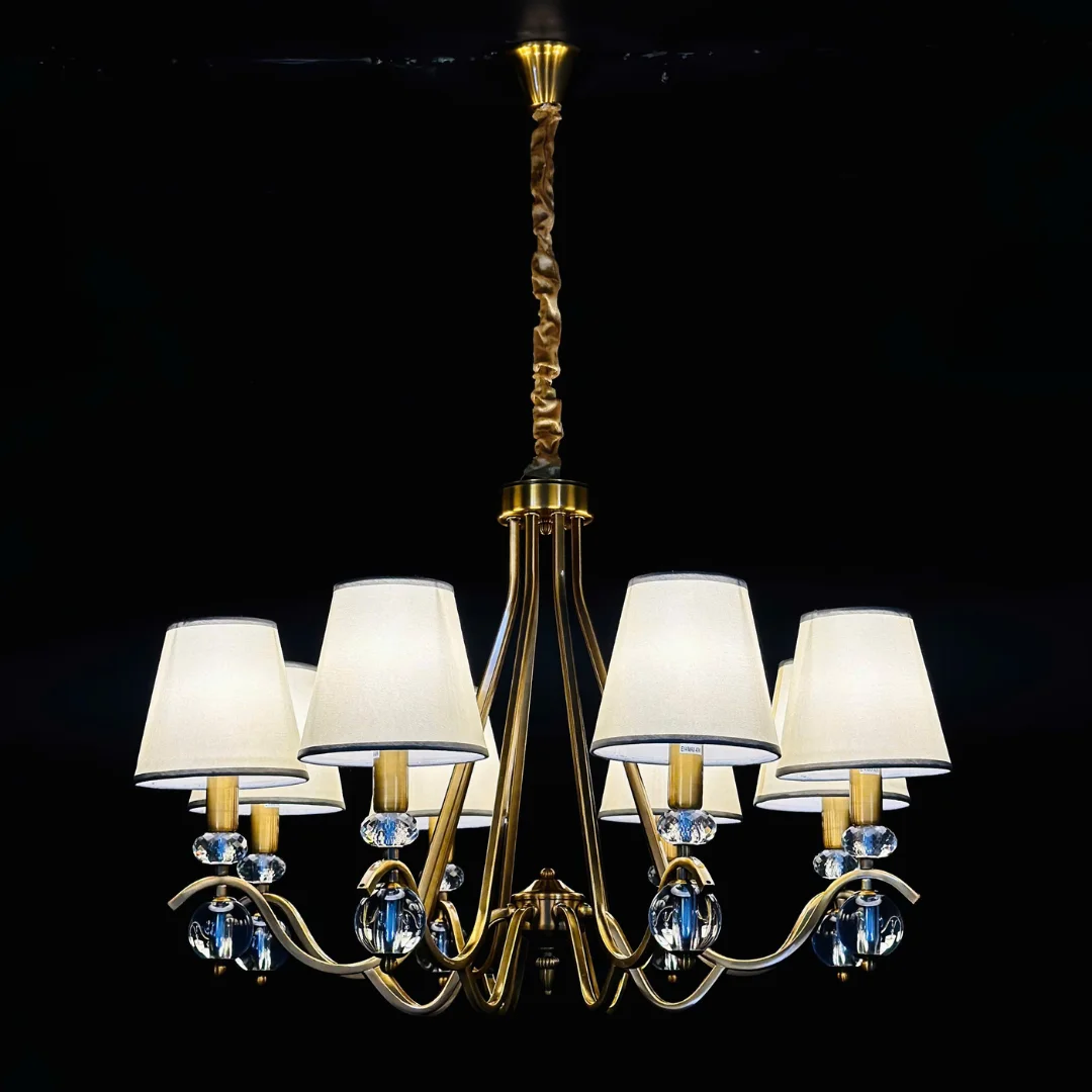 Điểm nhấn đáng chú ý là các chi tiết cầu pha lê nhỏ ngay dưới chao. Khi bật đèn, pha lê phản chiếu ánh sáng nhẹ, tạo cảm giác tinh tế và giúp tổng thể đèn trông “có chiều sâu” hơn mà vẫn gọn mắt, không rối.