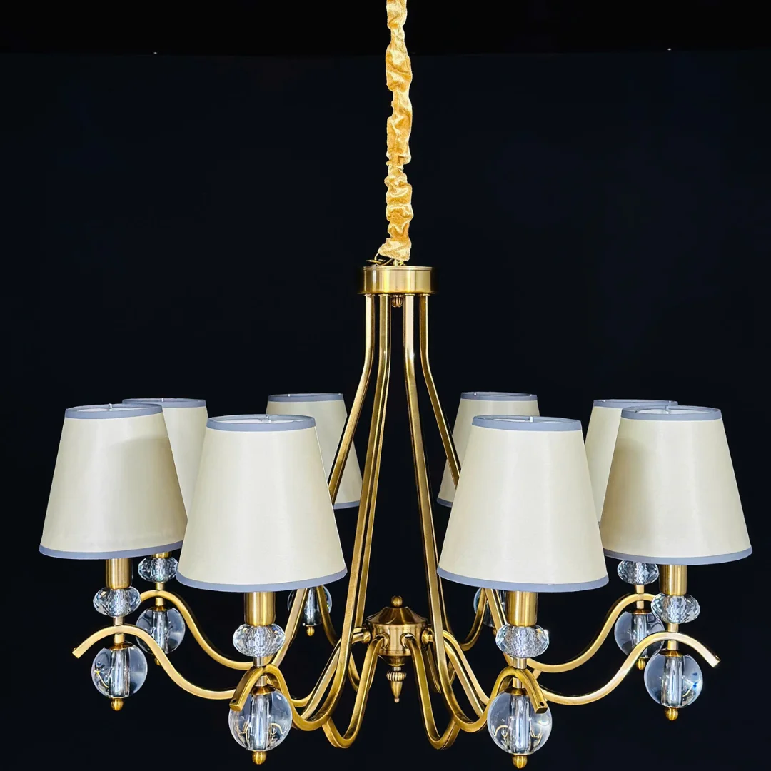 Đèn Chùm DC128 sở hữu bố cục tay đèn tỏa đều, tạo cảm giác cân đối và thoáng trần khi treo ở vị trí trung tâm. Chao vải dáng trụ gọn giúp ánh sáng tỏa mềm, hạn chế chói và phù hợp cho sinh hoạt hằng ngày, đặc biệt trong không gian phòng khách hoặc phòng ăn. Khung đèn hoàn thiện tông đồng ấm mang lại vẻ sang và dễ kết hợp với nội thất gỗ, tường sáng hoặc phong cách hiện đại ấm.