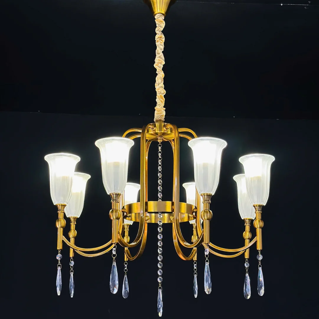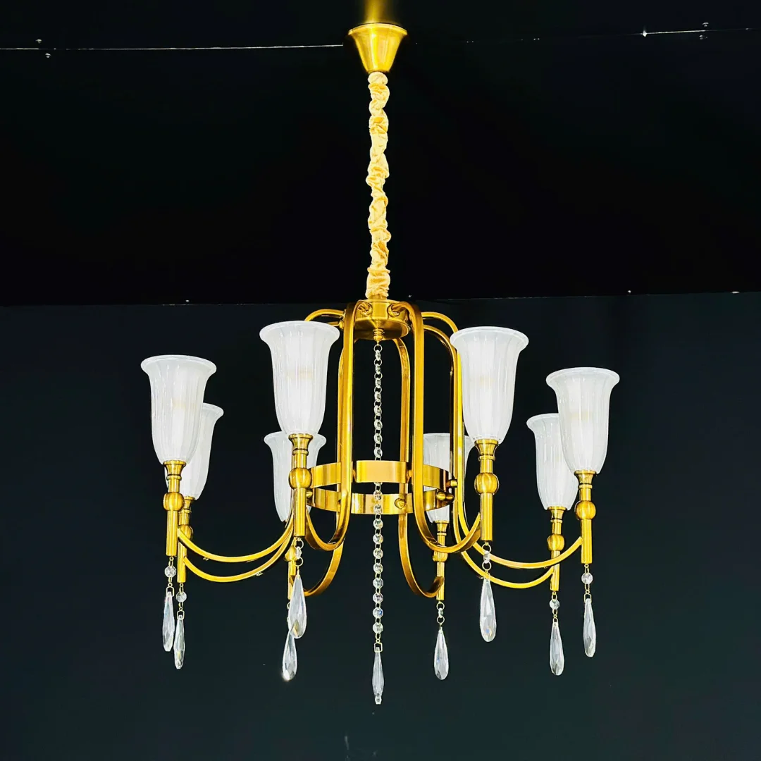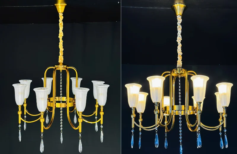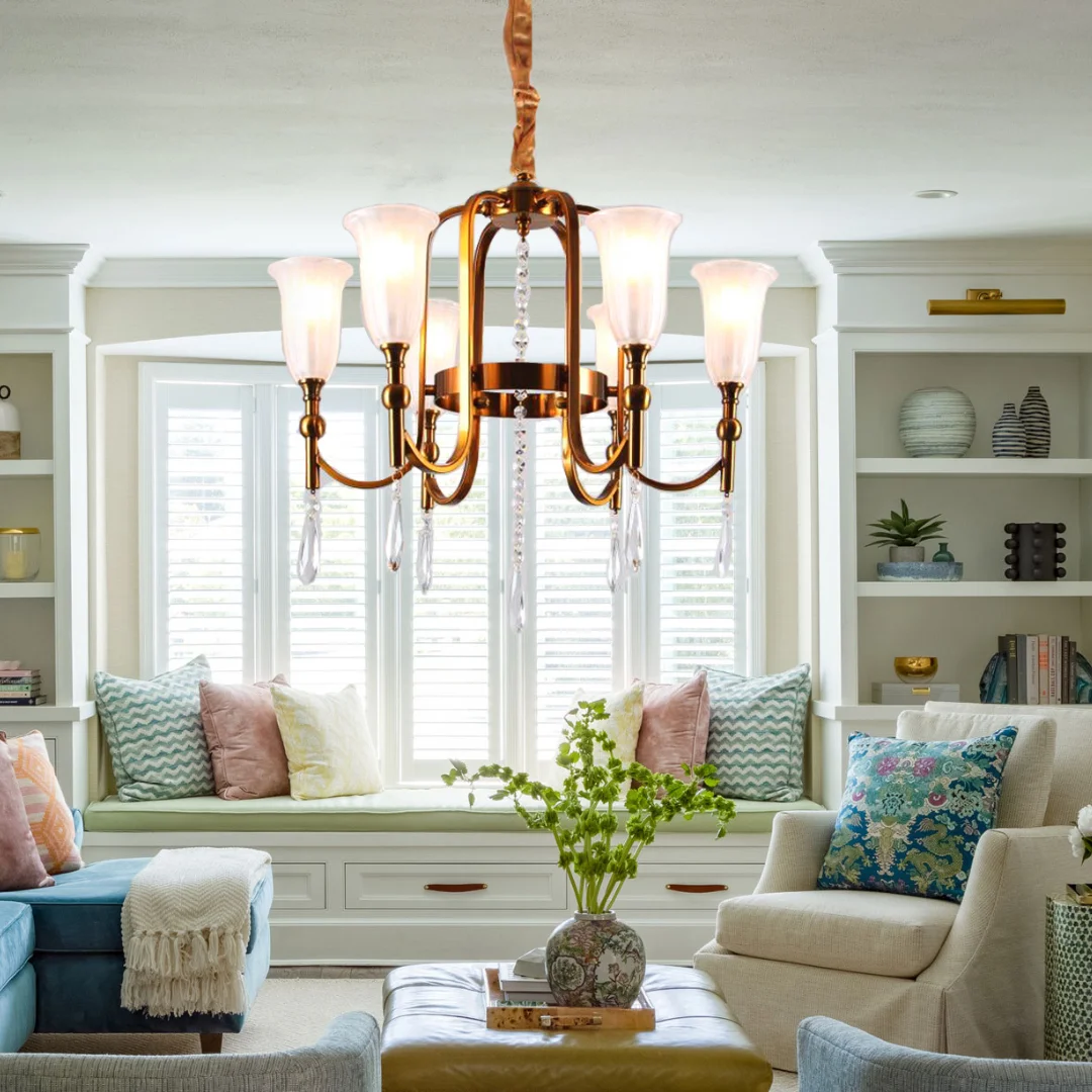 Đèn Chùm DC143 sở hữu bố cục tay đèn tỏa đều quanh thân trung tâm, tạo cảm giác cân đối và thoáng trần khi treo ở vị trí giữa phòng. Mỗi tay đèn đi kèm chao thủy tinh trắng dạng loa, giúp ánh sáng tỏa mềm, hạn chế cảm giác chói và tạo không khí ấm cúng vào buổi tối. Khung đèn hoàn thiện tông đồng ấm mang lại vẻ sang trọng, hợp với nội thất gỗ, tường sáng và các không gian theo phong cách hiện đại ấm hoặc tân cổ điển nhẹ.