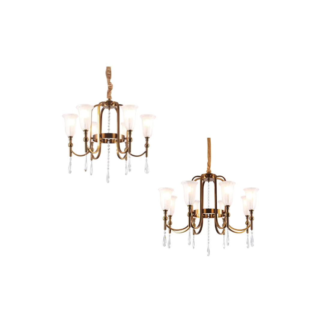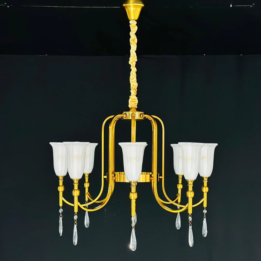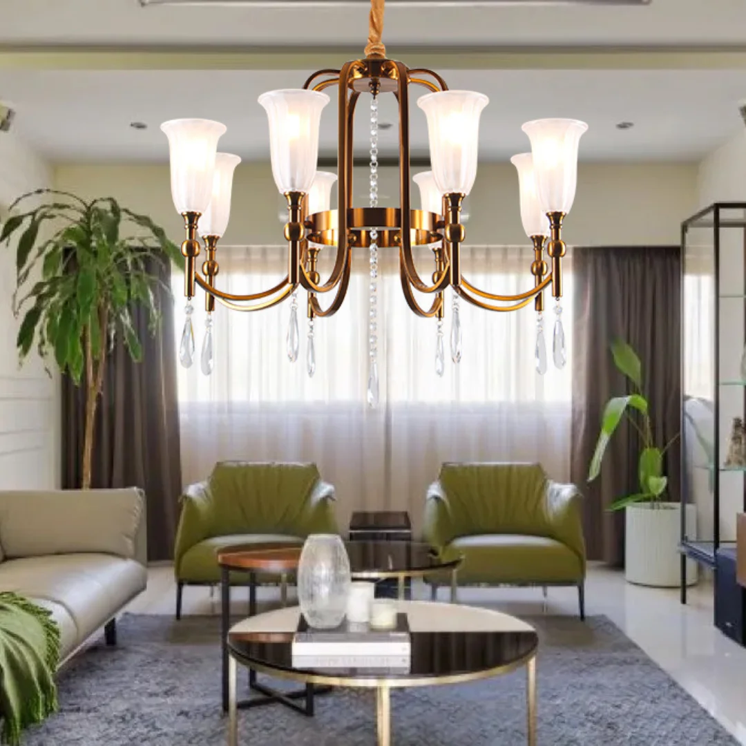 Đèn Chùm DC143 sở hữu bố cục tay đèn tỏa đều quanh thân trung tâm, tạo cảm giác cân đối và thoáng trần khi treo ở vị trí giữa phòng. Mỗi tay đèn đi kèm chao thủy tinh trắng dạng loa, giúp ánh sáng tỏa mềm, hạn chế cảm giác chói và tạo không khí ấm cúng vào buổi tối. Khung đèn hoàn thiện tông đồng ấm mang lại vẻ sang trọng, hợp với nội thất gỗ, tường sáng và các không gian theo phong cách hiện đại ấm hoặc tân cổ điển nhẹ.