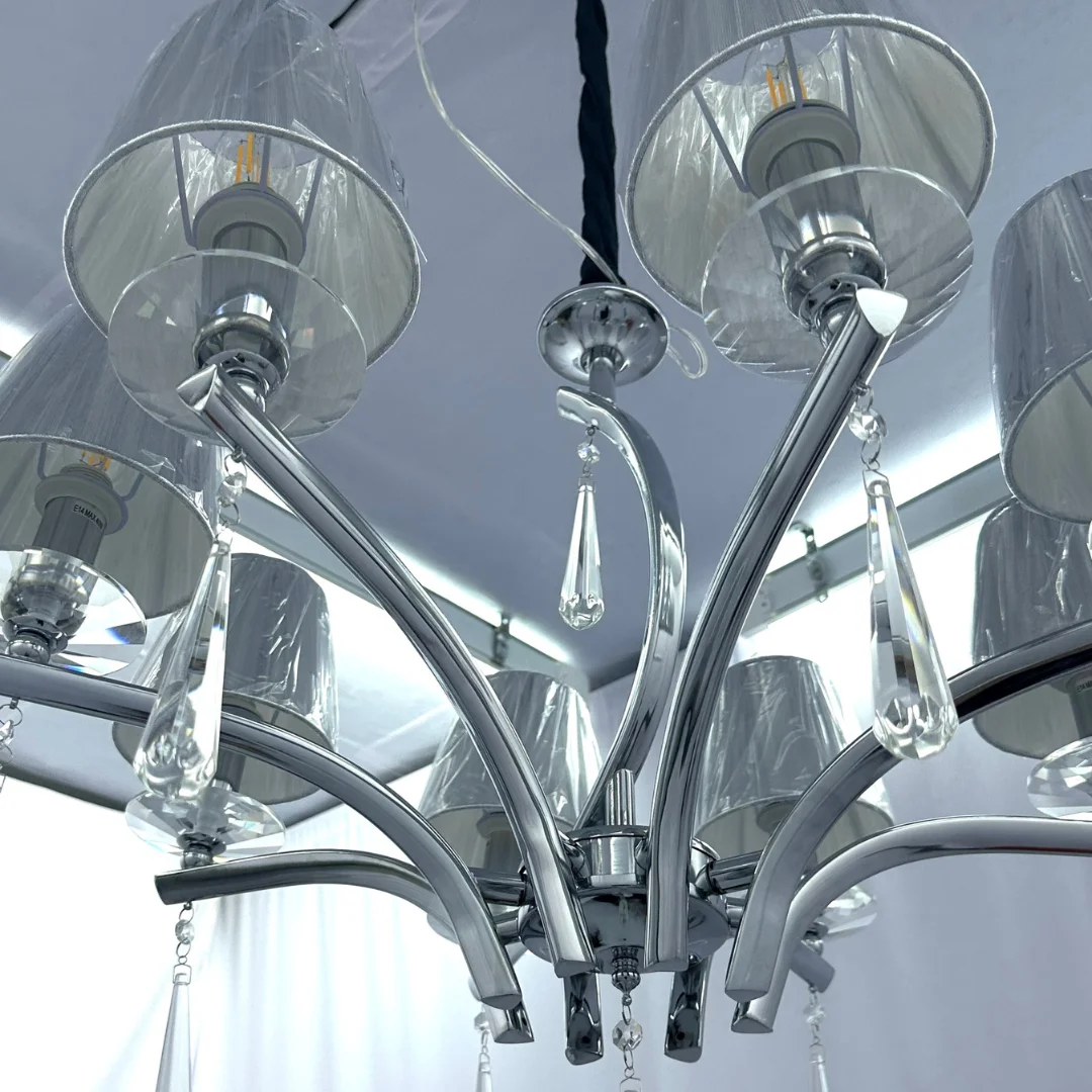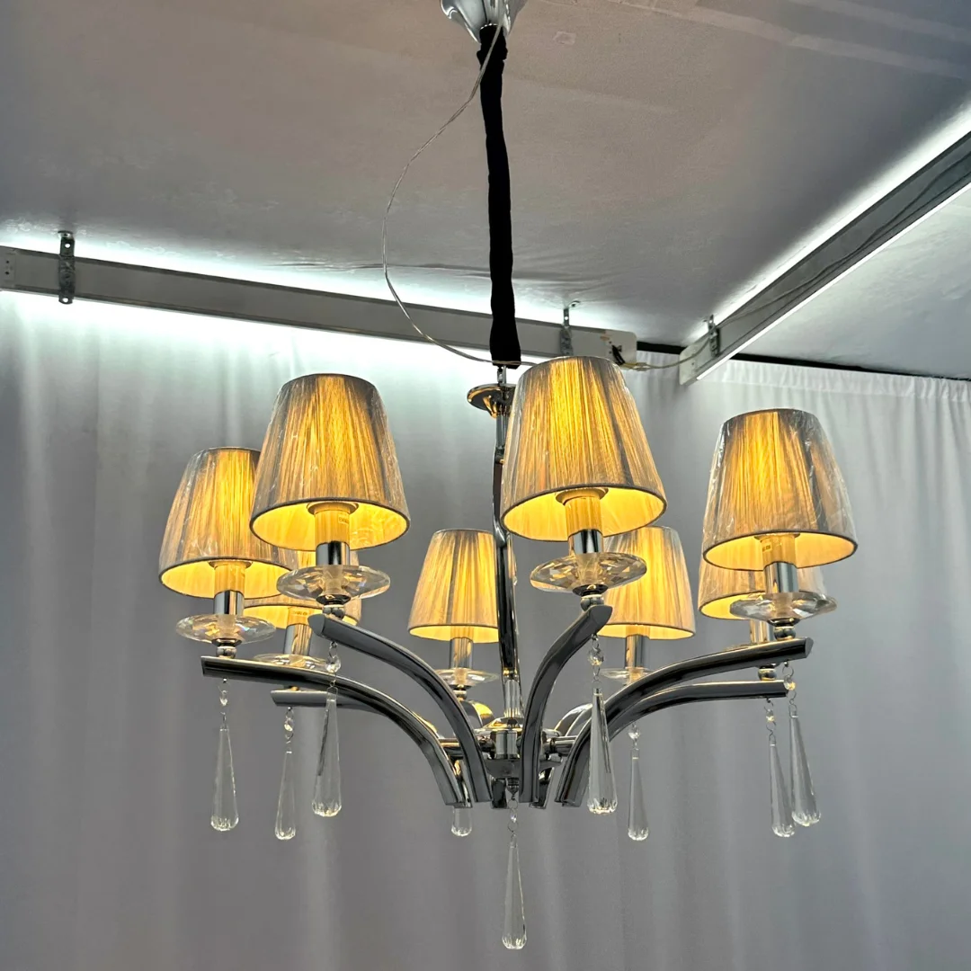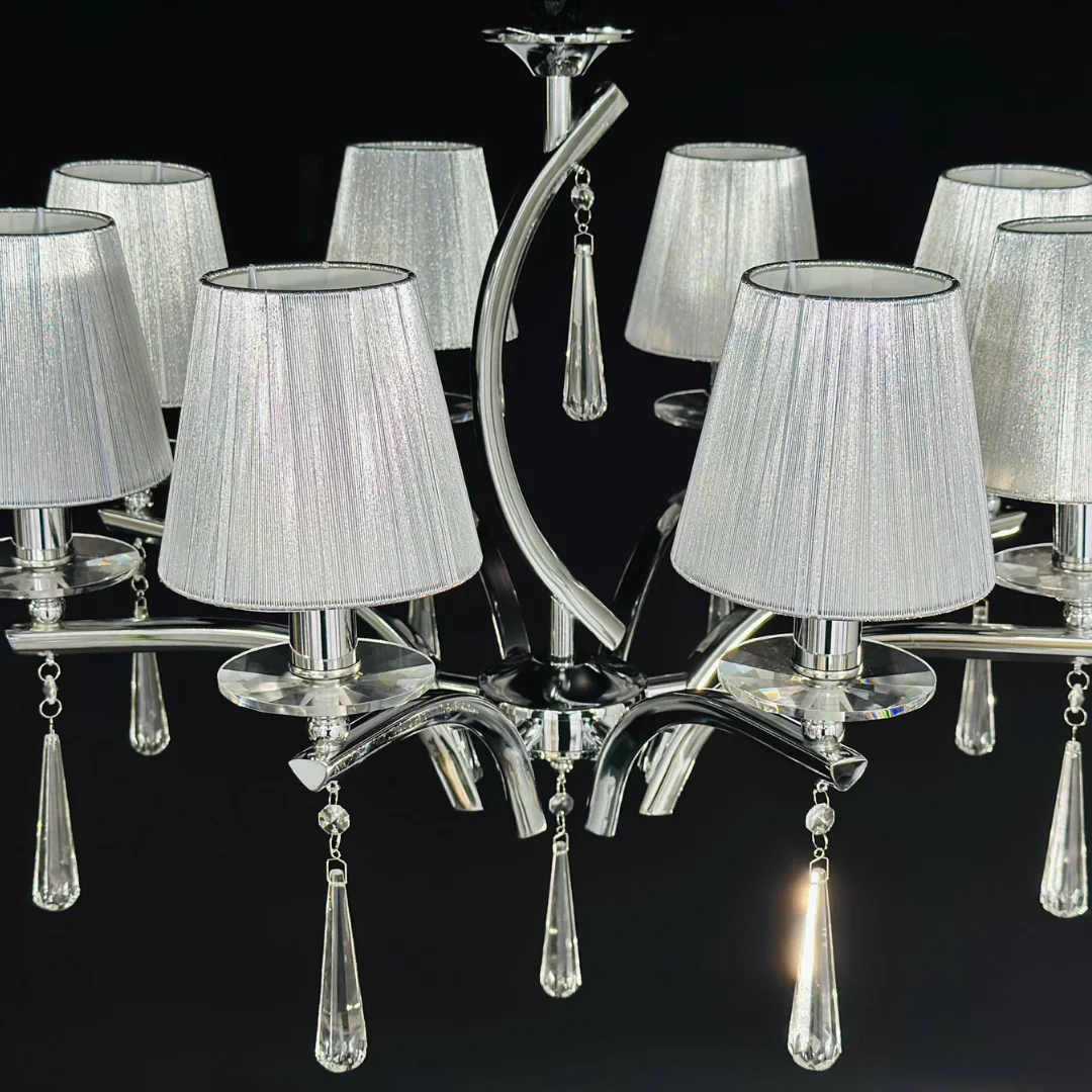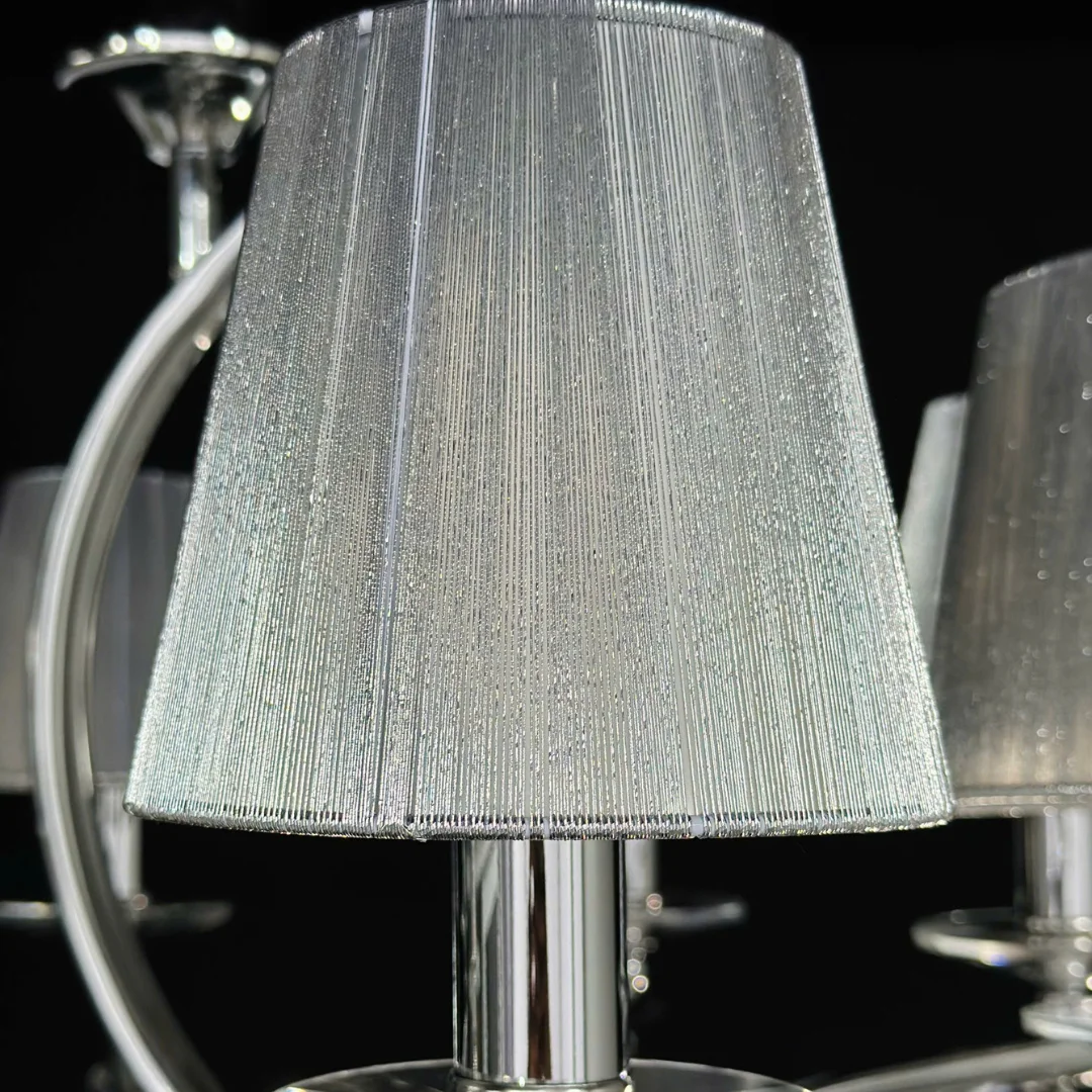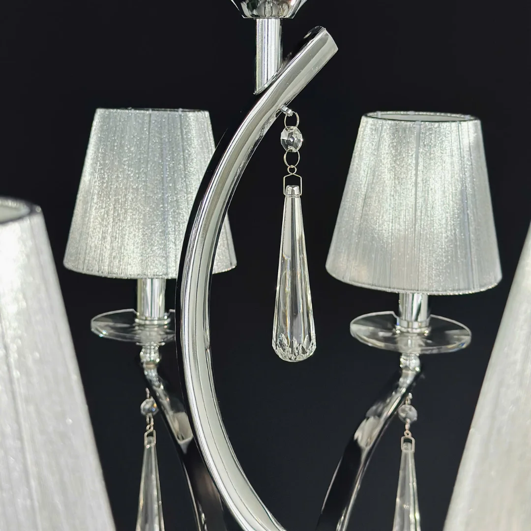 Đèn Chùm DC308 nổi bật với bộ khung mạ sáng cùng các tay đèn vươn cong mềm, tạo cảm giác thoáng trần nhưng vẫn có điểm nhấn sang. Chao vải tông xám dáng trụ giúp ánh sáng tỏa mềm hơn, giảm chói và tạo không khí dễ chịu cho phòng khách hoặc phòng ngủ master. Bố cục đèn gọn gàng, không rườm rà nên rất hợp nội thất hiện đại, tối giản sang hoặc phong cách căn hộ tông trung tính.