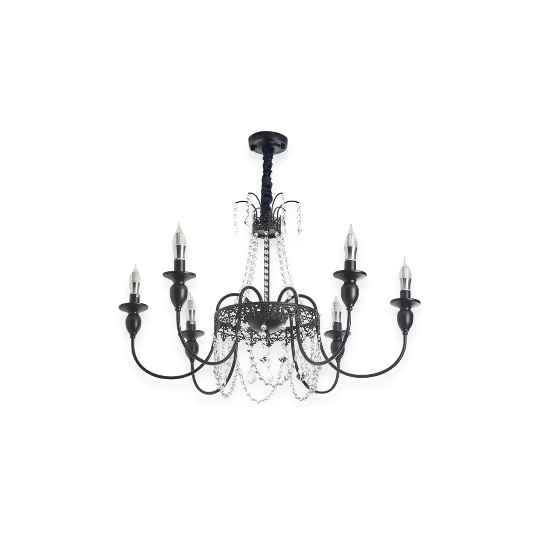 Đèn Chùm DC53 có form chùm nến 8 tay tỏa đều, tạo bố cục cân đối khi treo ở vị trí trung tâm. Phần tay đèn vươn cong mềm, kết hợp thân đèn tông đen giúp chiếc đèn trông sang và rõ nét trên nền tường sáng. Điểm nhấn quan trọng nằm ở phần chao giữa dạng ren, tạo cảm giác tinh xảo và giúp tổng thể đèn bớt “cứng”, phù hợp nhiều phong cách nội thất.