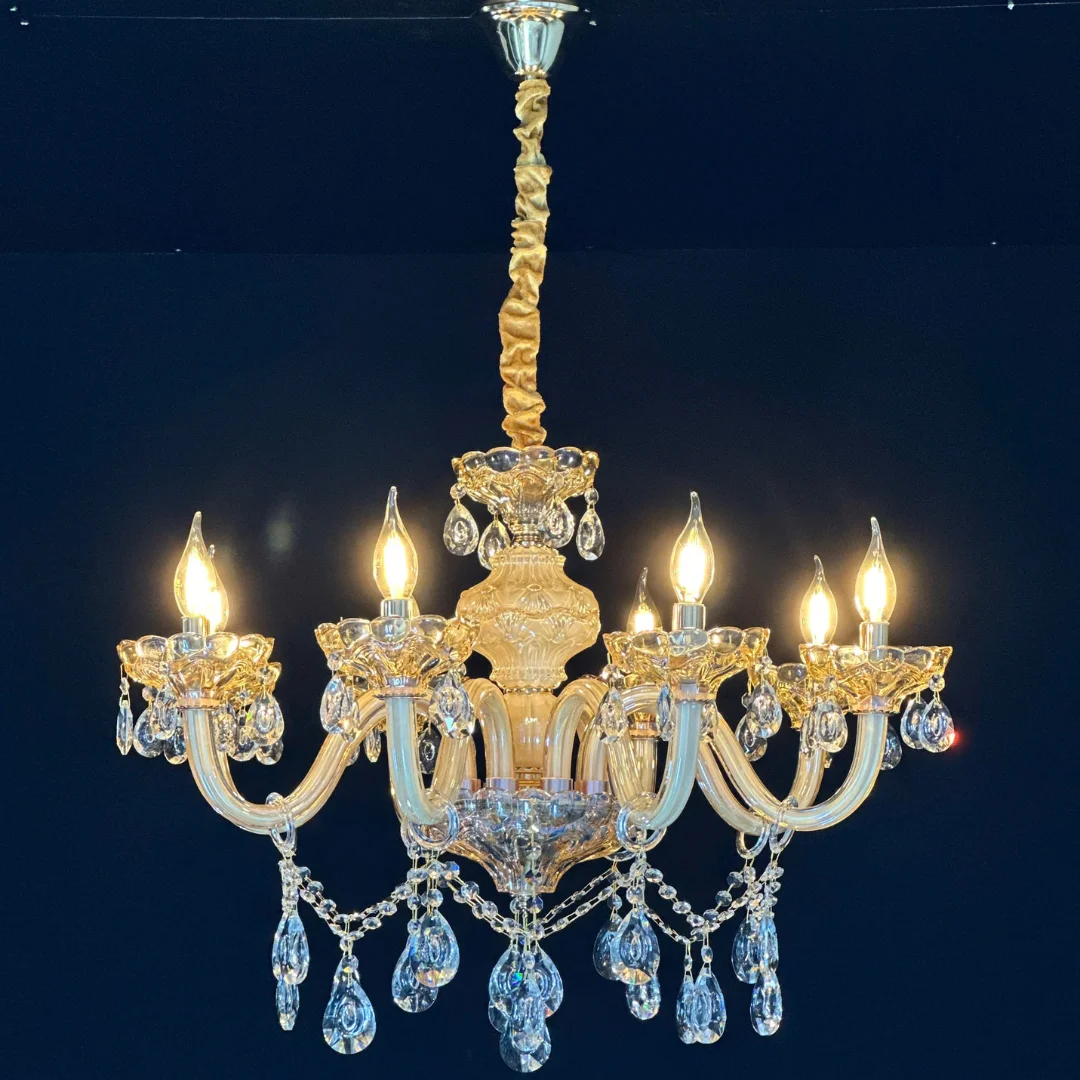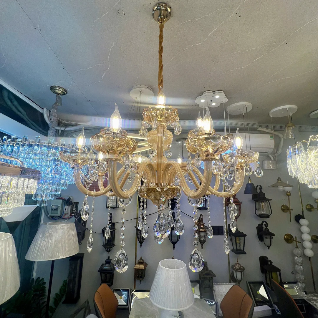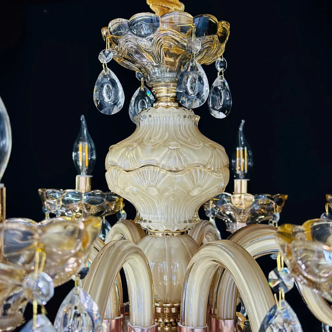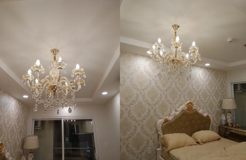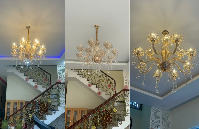 Đèn Chùm DC86096 có bố cục treo cân đối, form đèn thanh thoát nên không làm trần bị “nặng” dù treo ở vị trí trung tâm. Các tay đèn được sắp xếp đều, kết hợp chụp đèn tinh tế tạo nên tổng thể gọn gàng và dễ nhìn. Nhờ tỷ lệ hài hòa, mẫu 12 tay phù hợp phòng khách rộng hoặc khu vực tiếp khách; trong khi bản 8 tay và 6 tay gọn hơn, dễ ứng dụng cho phòng ăn hoặc phòng ngủ.