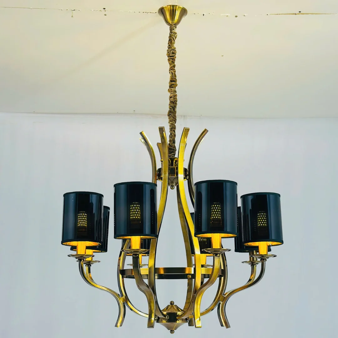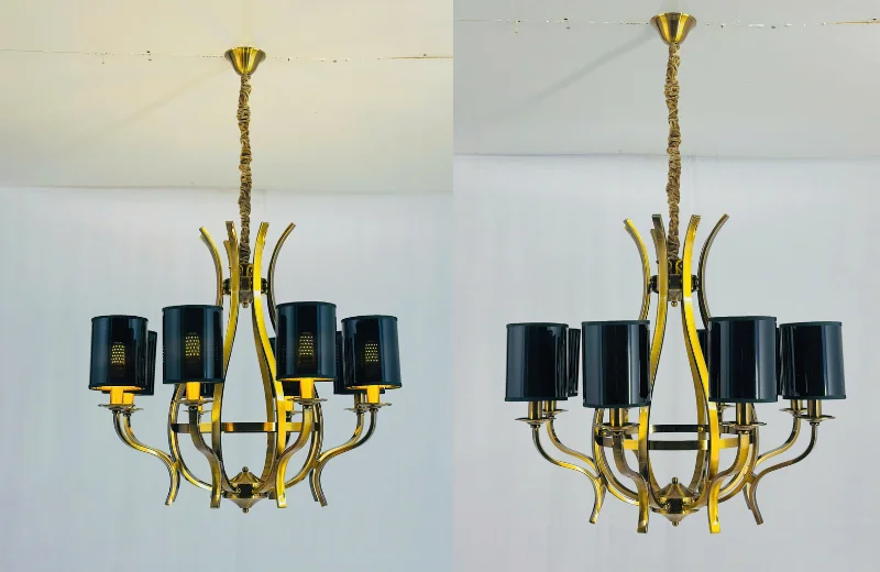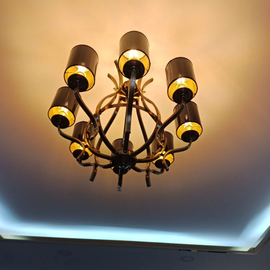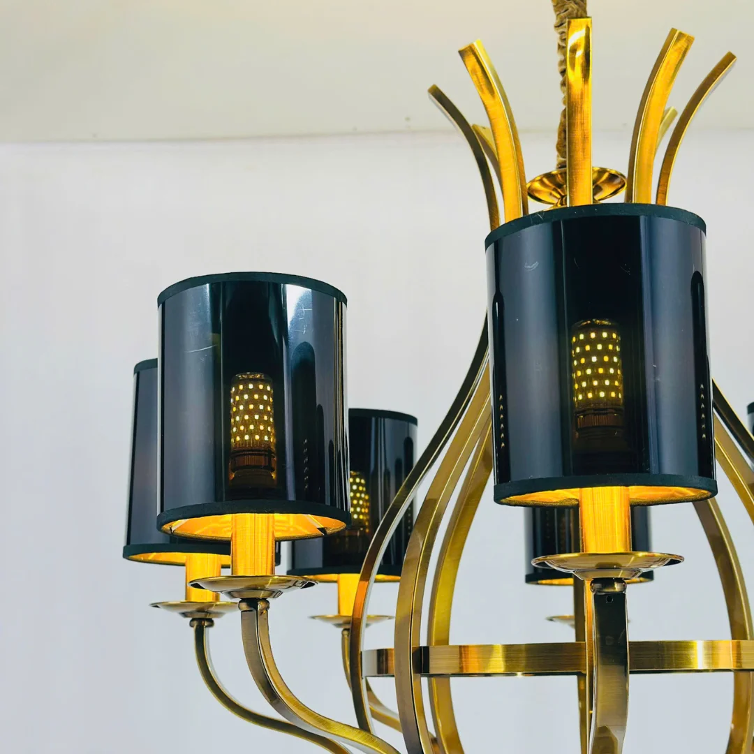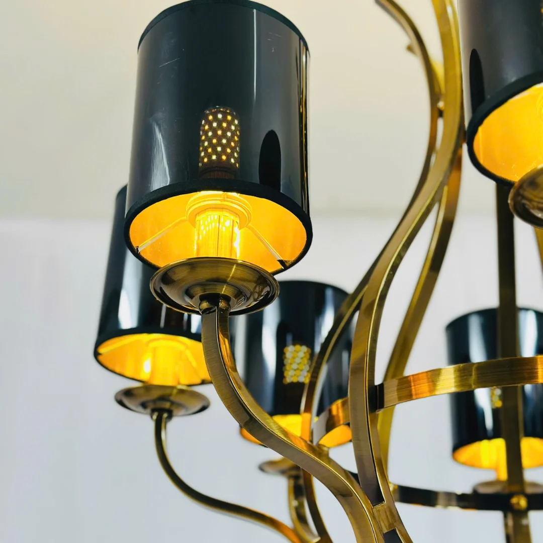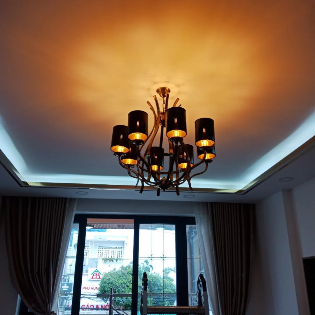Đèn Chùm DC9018 có bố cục tay đèn vươn cong mềm, tạo cảm giác thoáng trần nhưng vẫn bề thế khi nhìn trực diện. Phần thân trung tâm dạng khung mở giúp tổng thể gọn mắt, phù hợp treo ở phòng khách, khu tiếp khách hoặc không gian trần vừa. Điểm nổi bật nhất là hệ chao trụ màu đen, mang lại vẻ cá tính và hiện đại, đồng thời giúp ánh sáng trông ấm hơn nhờ lớp lòng chao phản sáng.