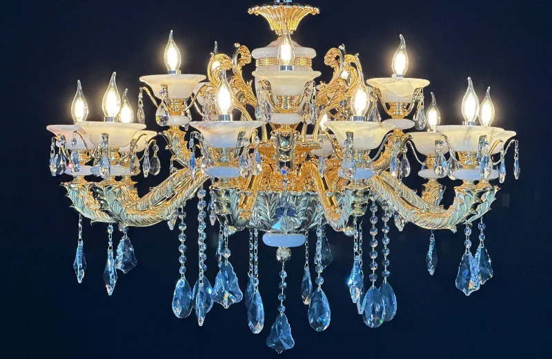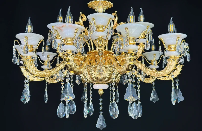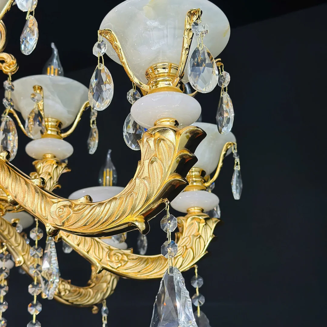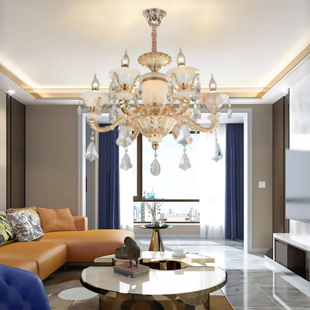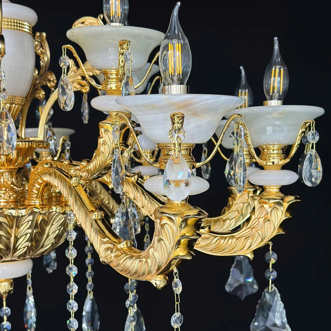 Đèn Chùm Pha Lê DC6239 mang dáng chùm nến cổ điển với tay đèn uốn cong cân đối, tạo cảm giác bề thế nhưng vẫn hài hòa khi treo ở trung tâm phòng. Chao đá màu trắng sữa được bố trí tại các vị trí đèn giúp tổng thể thanh lịch hơn và làm ánh sáng dịu, hạn chế chói. Khung đèn tông vàng ấm kết hợp các chi tiết chạm khắc tạo vẻ cao cấp, phù hợp nội thất tân cổ điển, cổ điển nhẹ hoặc không gian sang theo tông ấm.