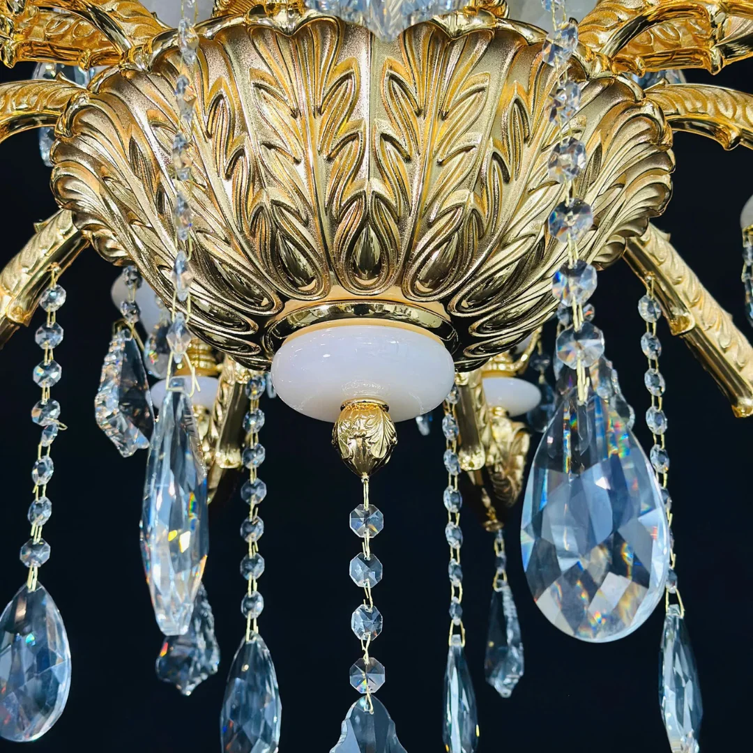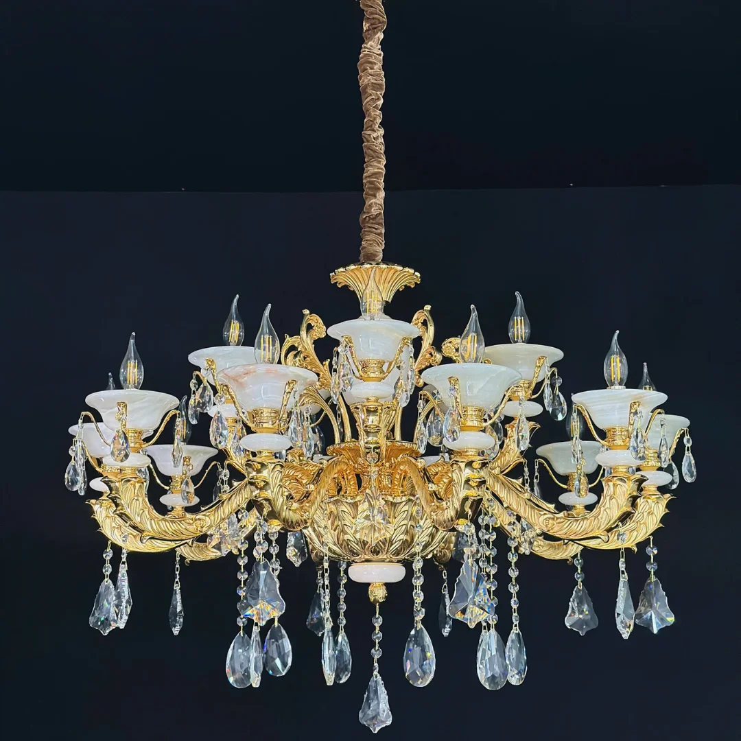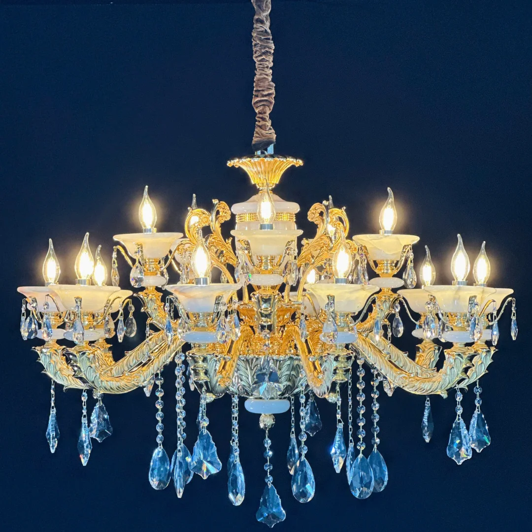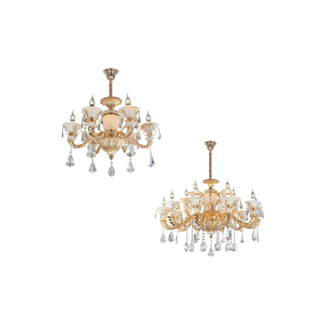 Đèn Chùm Pha Lê DC6239 mang dáng chùm nến cổ điển với tay đèn uốn cong cân đối, tạo cảm giác bề thế nhưng vẫn hài hòa khi treo ở trung tâm phòng. Chao đá màu trắng sữa được bố trí tại các vị trí đèn giúp tổng thể thanh lịch hơn và làm ánh sáng dịu, hạn chế chói. Khung đèn tông vàng ấm kết hợp các chi tiết chạm khắc tạo vẻ cao cấp, phù hợp nội thất tân cổ điển, cổ điển nhẹ hoặc không gian sang theo tông ấm.