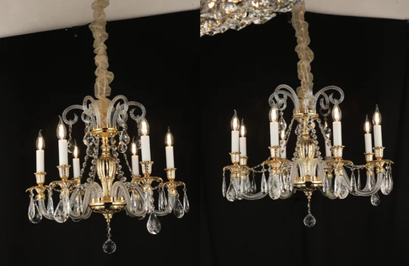 Đèn Chùm Pha Lê DC8180 sở hữu dáng chùm nến cổ điển với các tay đèn vươn rộng theo bố cục cân xứng, tạo cảm giác sang và bề thế khi treo ở trung tâm trần. Các tay đèn uốn cong mềm, kết hợp bóng nến E14 giúp ánh sáng lên đẹp, tạo sắc sáng ấm và phù hợp không gian tiếp khách. Thân đèn tông đồng là điểm nhấn quan trọng, mang lại cảm giác cao cấp và dễ hòa hợp với nội thất gỗ, đá, tường sáng hoặc phong cách tân cổ điển.
