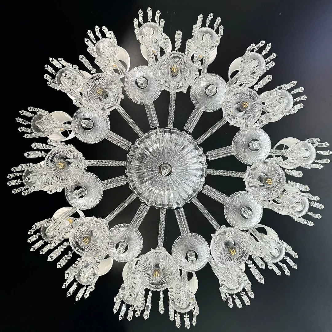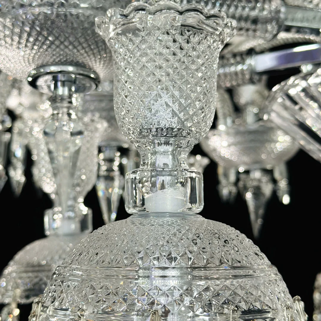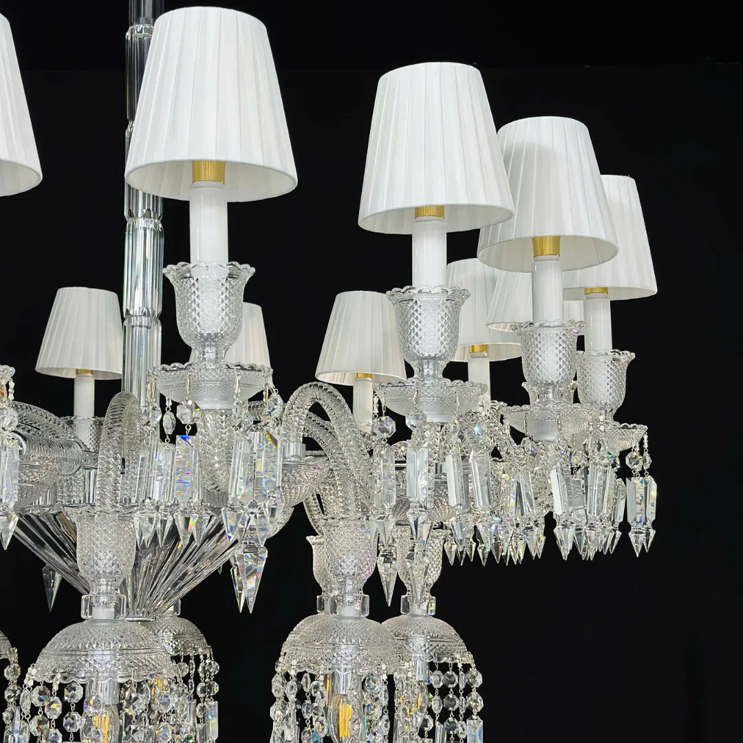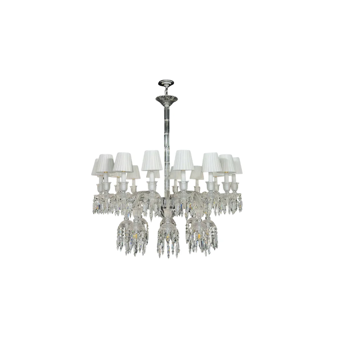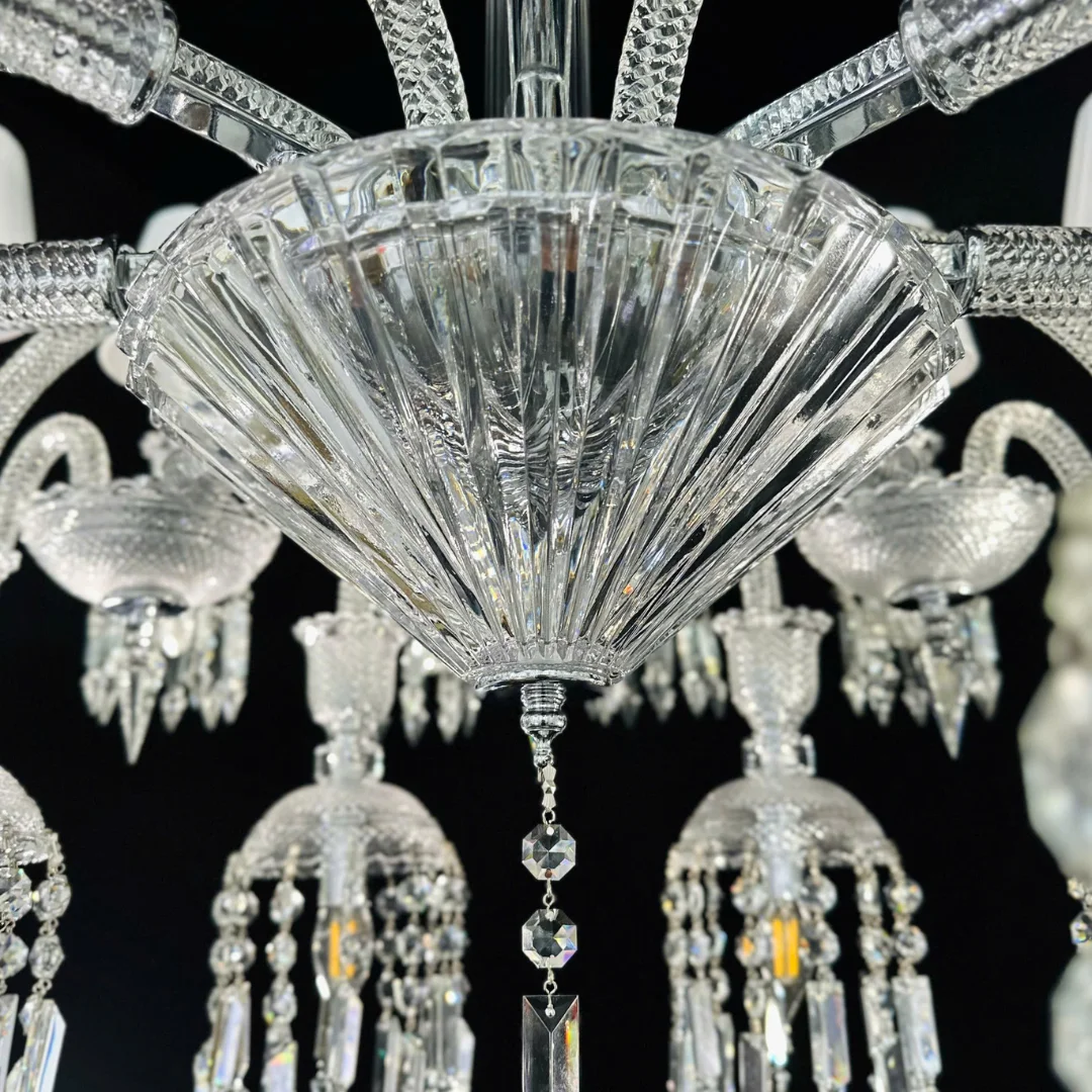 Đèn Chùm Pha Lê DC8805T24 tạo cảm giác như một đóa hoa pha lê nhiều tầng đang nở rộ giữa không trung. Trụ giữa bằng pha lê trong suốt chia thành nhiều đoạn, kết nối với hệ tay đèn cong, mỗi tay đèn được tô điểm bằng chi tiết pha lê và cụm hạt rủ phía dưới. Các chụp vải nhỏ gọn bên trên từng bóng E14 giúp ánh sáng trở nên mềm hơn, đồng thời tạo nên nhịp điệu thị giác rất đẹp khi nhìn tổng thể.