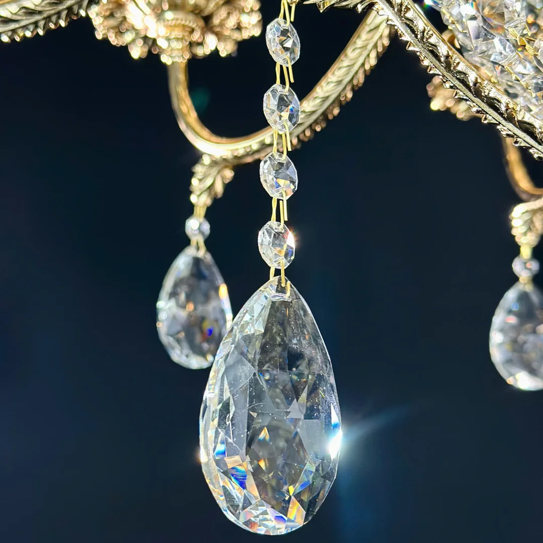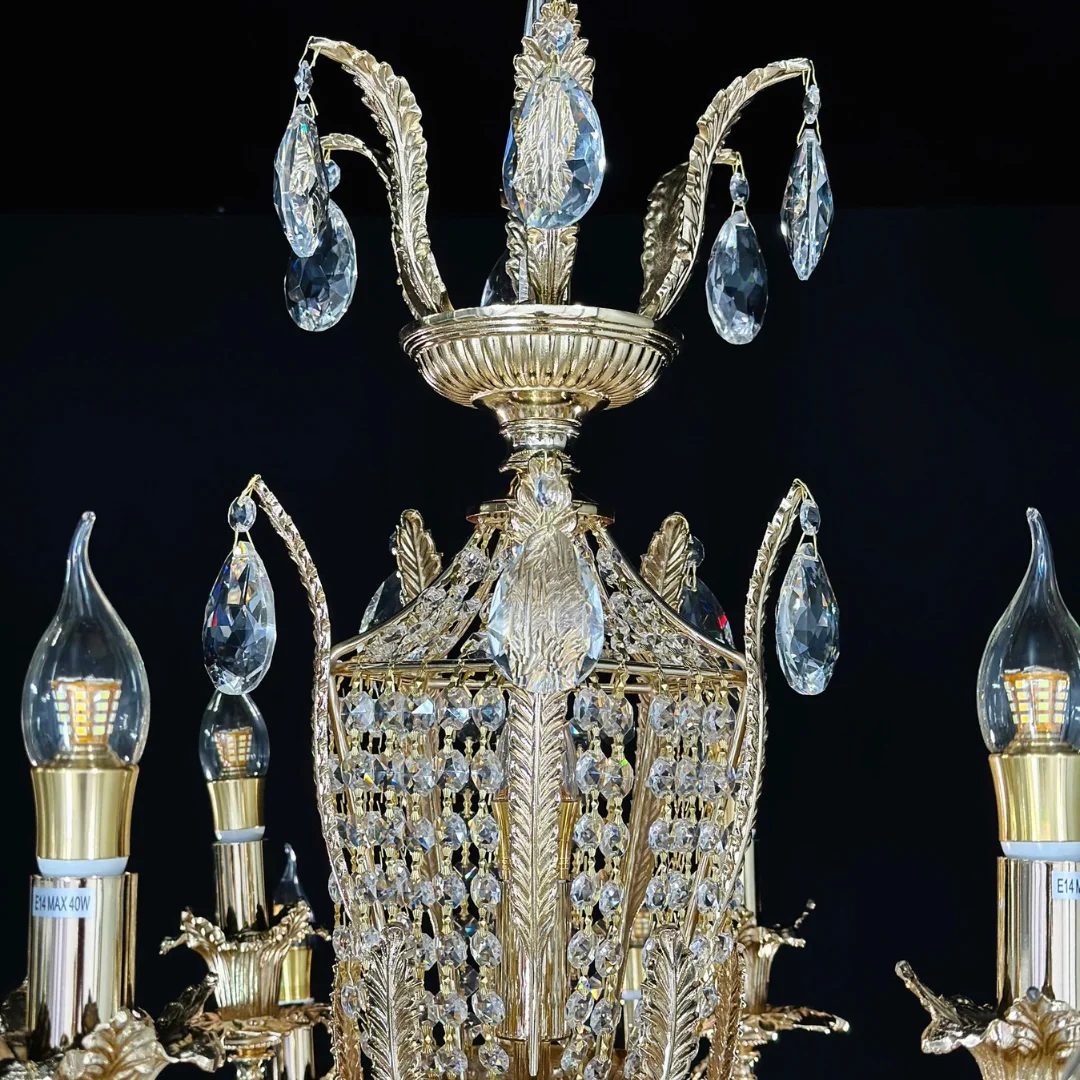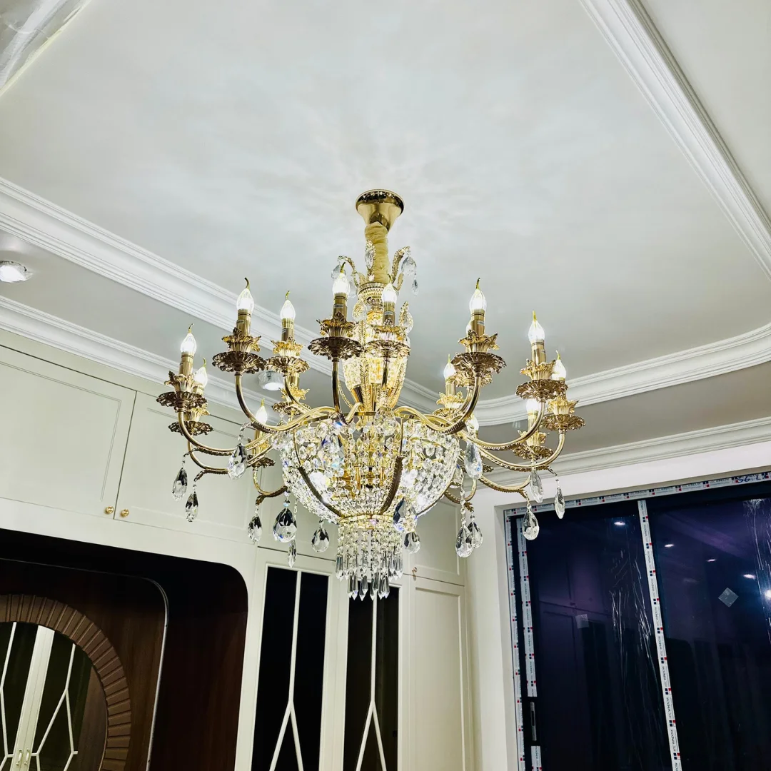 Pha lê K9 có độ trong cao và khả năng bắt sáng mạnh, giúp hiệu ứng lấp lánh rõ ngay khi bật đèn. Nhờ hệ bóng trên tay kết hợp bóng ở lớp pha lê, ánh sáng tạo ra vừa đủ mạnh cho không gian rộng vừa có hiệu ứng sáng đa tầng, khiến căn phòng trông lung linh và ấm áp hơn vào buổi tối.