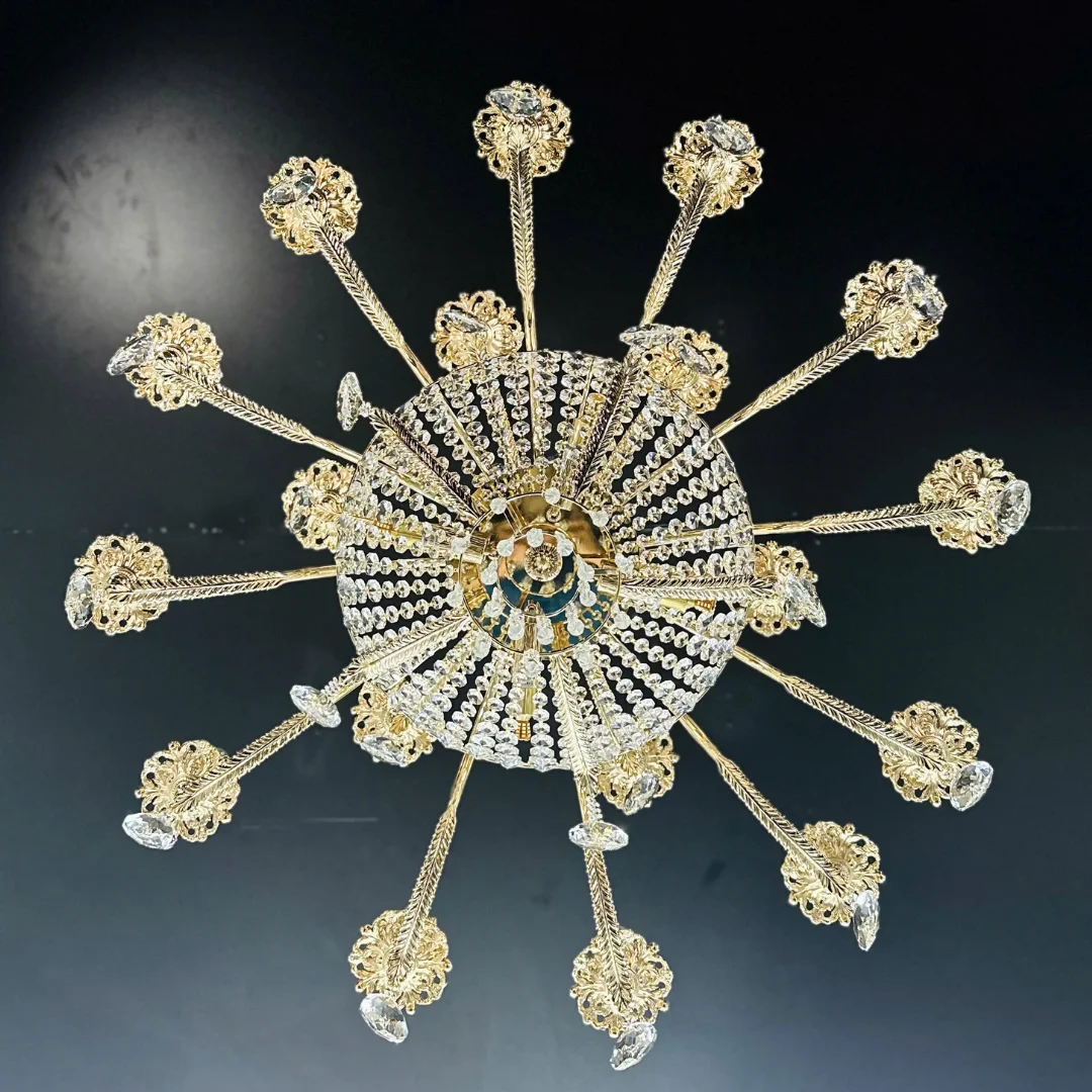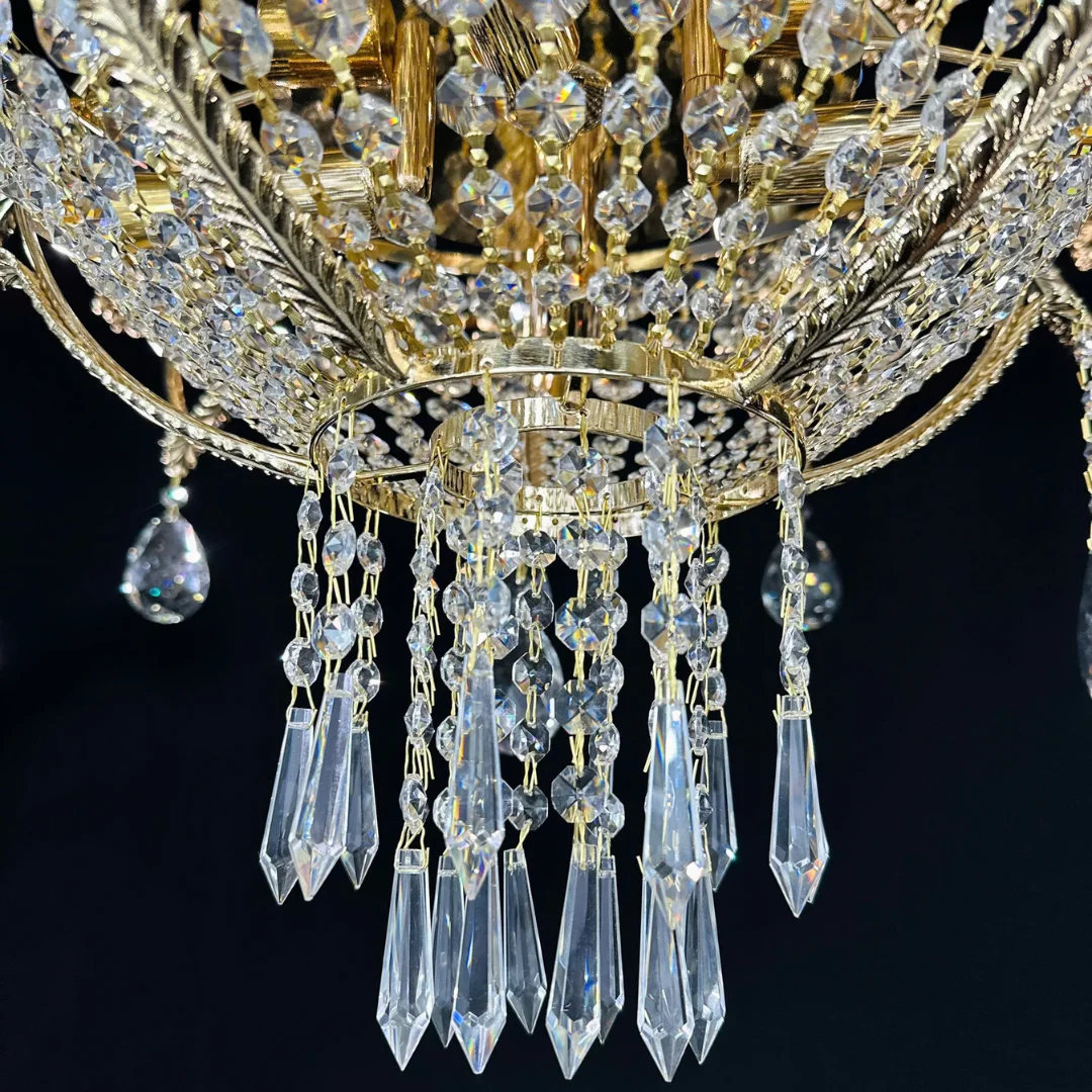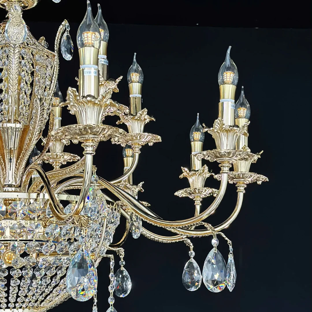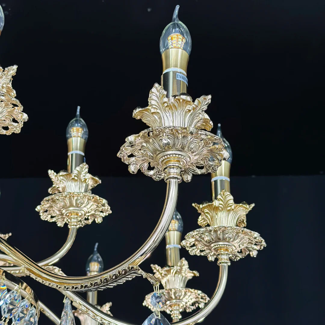 Pha lê K9 có độ trong cao và khả năng bắt sáng mạnh, giúp hiệu ứng lấp lánh rõ ngay khi bật đèn. Nhờ hệ bóng trên tay kết hợp bóng ở lớp pha lê, ánh sáng tạo ra vừa đủ mạnh cho không gian rộng vừa có hiệu ứng sáng đa tầng, khiến căn phòng trông lung linh và ấm áp hơn vào buổi tối.