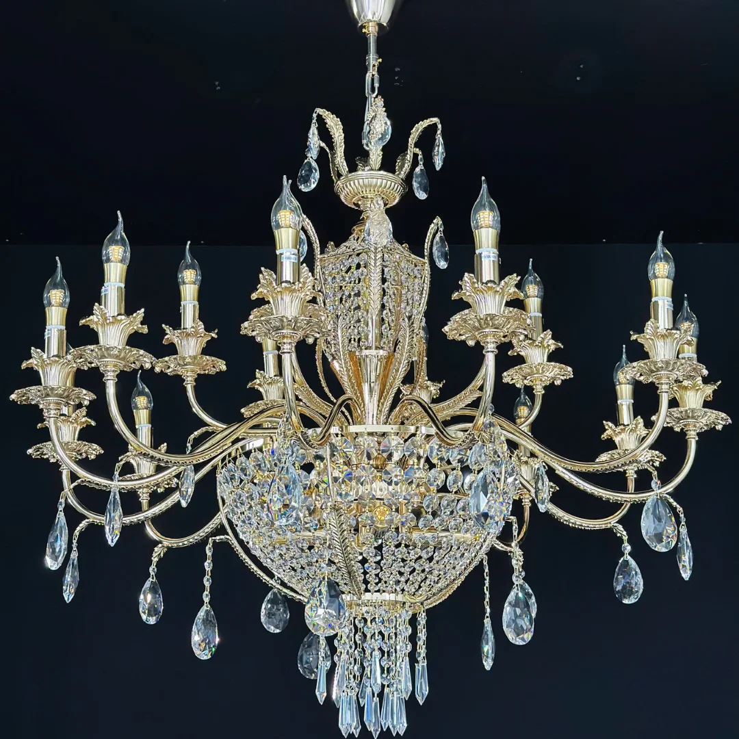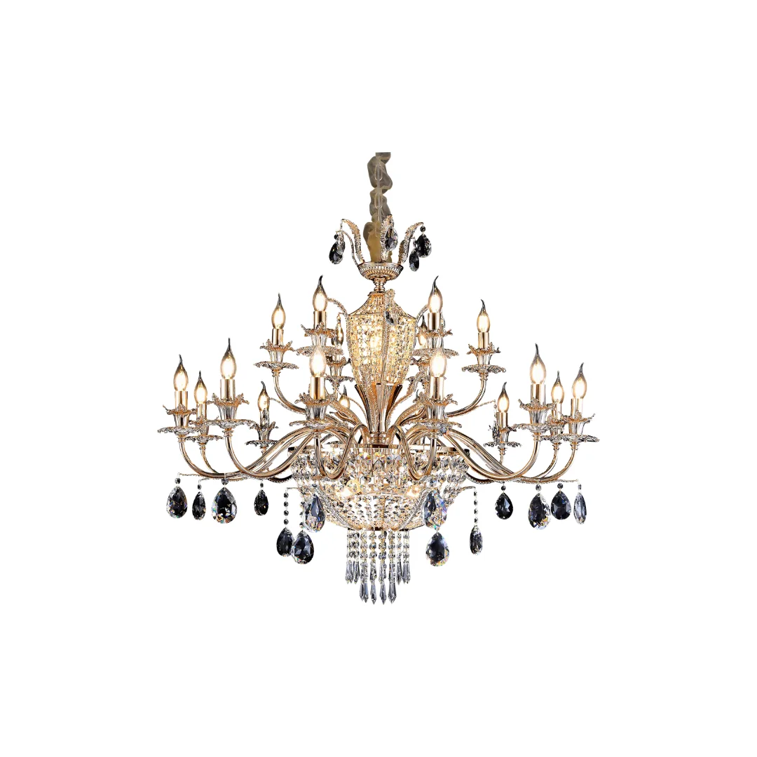Đèn Chùm Pha Lê DC8908T18 mang phong cách sang trọng với bố cục tay đèn tỏa đều theo vòng tròn lớn, giúp trần nhà trông cân đối và bề thế. Phần thân trung tâm được nhấn bằng cụm pha lê dày, phía dưới là dải pha lê rũ tạo điểm rơi đẹp, giúp tổng thể có chiều sâu và nhìn rất nổi bật khi treo ở vị trí trung tâm. Dọc theo tay đèn là các chi tiết pha lê thả kết hợp kiểu bóng nến, tạo cảm giác tinh xảo và sang đúng chất chùm pha lê cao cấp.