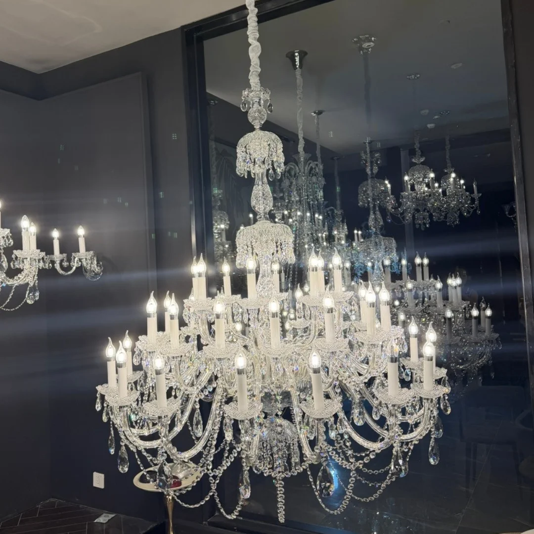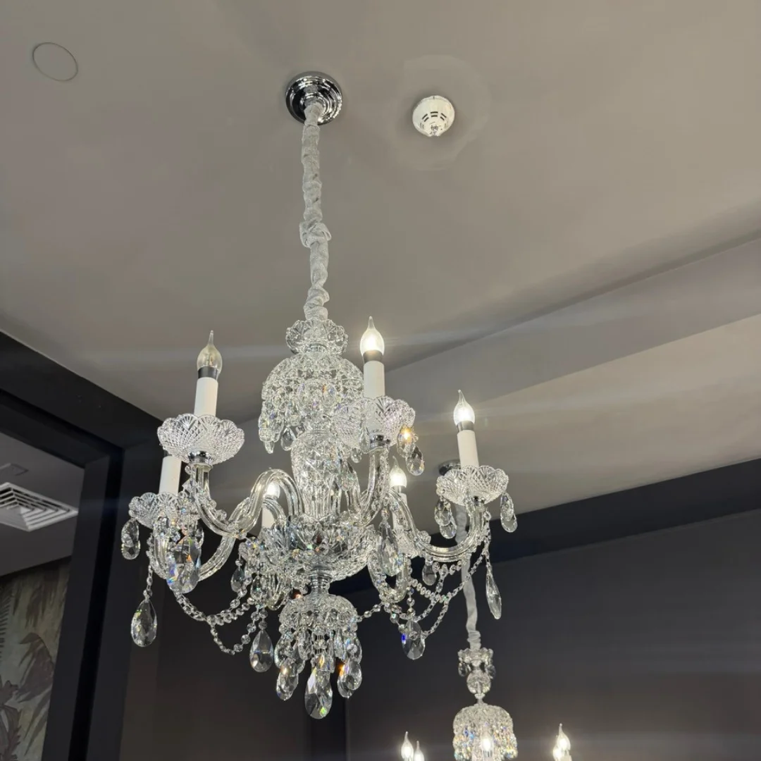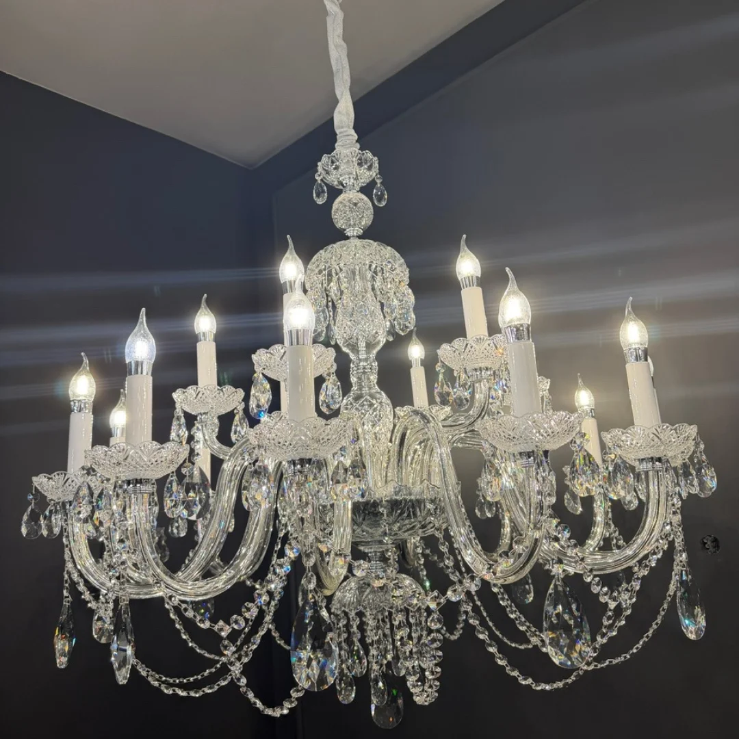 Đèn Chùm Pha Lê DC9903 gây ấn tượng bởi dáng chùm nến bề thế, đúng tinh thần cổ điển châu Âu. Các tay đèn vươn ra đều, tạo bố cục cân xứng, giúp đèn nhìn “đầy” nhưng không rối. Phần thân trung tâm được nhấn bằng các chi tiết pha lê trong suốt, kết hợp chuỗi hạt pha lê và giọt thả rũ xuống, tạo cảm giác sang trọng và mềm mại khi nhìn ở mọi góc.