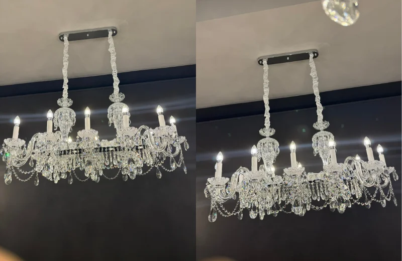 Chất liệu chính của dòng này là pha lê K9 cao cấp, có độ trong tốt và khả năng phản chiếu ánh sáng rõ, giúp hiệu ứng lấp lánh nổi bật khi bật đèn. Nhờ hệ pha lê nhiều lớp, ánh sáng từ bóng E14 không chỉ sáng mà còn tạo chiều sâu, phù hợp những không gian cần “điểm nhấn trung tâm” như phòng khách lớn, sảnh đón hoặc khu trưng bày. Ngoài các mẫu tròn, phiên bản DC9903L1200 dạng treo ngang là lựa chọn hợp lý cho bàn ăn dài hoặc khu vực cần ánh sáng trải đều theo chiều dài, giúp bố cục không gian cân đối hơn.