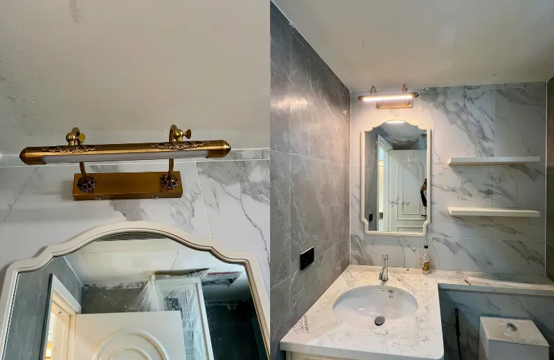 Mẫu đèn mang phong cách cổ điển kết hợp hiện đại, giúp tạo điểm nhấn nổi bật cho bức tường khi lắp đặt phía trên tranh hoặc gương trang trí. -