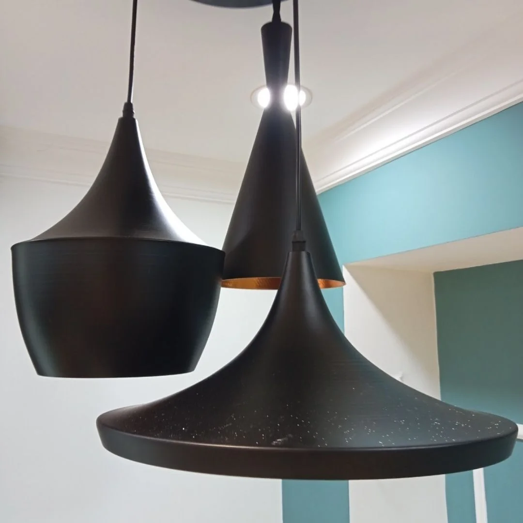 Về chất liệu, toàn bộ dòng sản phẩm được làm từ kim loại sơn tĩnh điện, giúp đèn có độ cứng cáp và ổn định trong quá trình sử dụng. Chất liệu này rất phù hợp với đèn thả trang trí vì vừa bền, vừa giữ được hình thức đẹp sau thời gian dài. Bề mặt sơn tĩnh điện cũng hỗ trợ lau chùi dễ dàng hơn, hạn chế bám bẩn và giúp sản phẩm luôn giữ được vẻ ngoài sạch sẽ, chỉn chu.