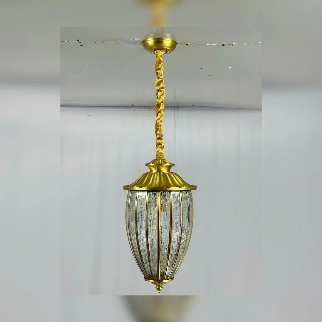 Đèn Thả Đồng TD41 có thân đèn thon dài, chia thành nhiều “múi” bởi những thanh đồng chạy dọc, tạo chiều sâu và hình khối rõ ràng. Phần chụp trên được uốn lượn với nhiều nếp gợn, gợi cảm giác cổ điển nhưng không nặng nề. Khi bật sáng, ánh đèn xuyên qua từng khe kính, tạo nên lớp ánh sáng dịu nhưng rất nổi bật.
