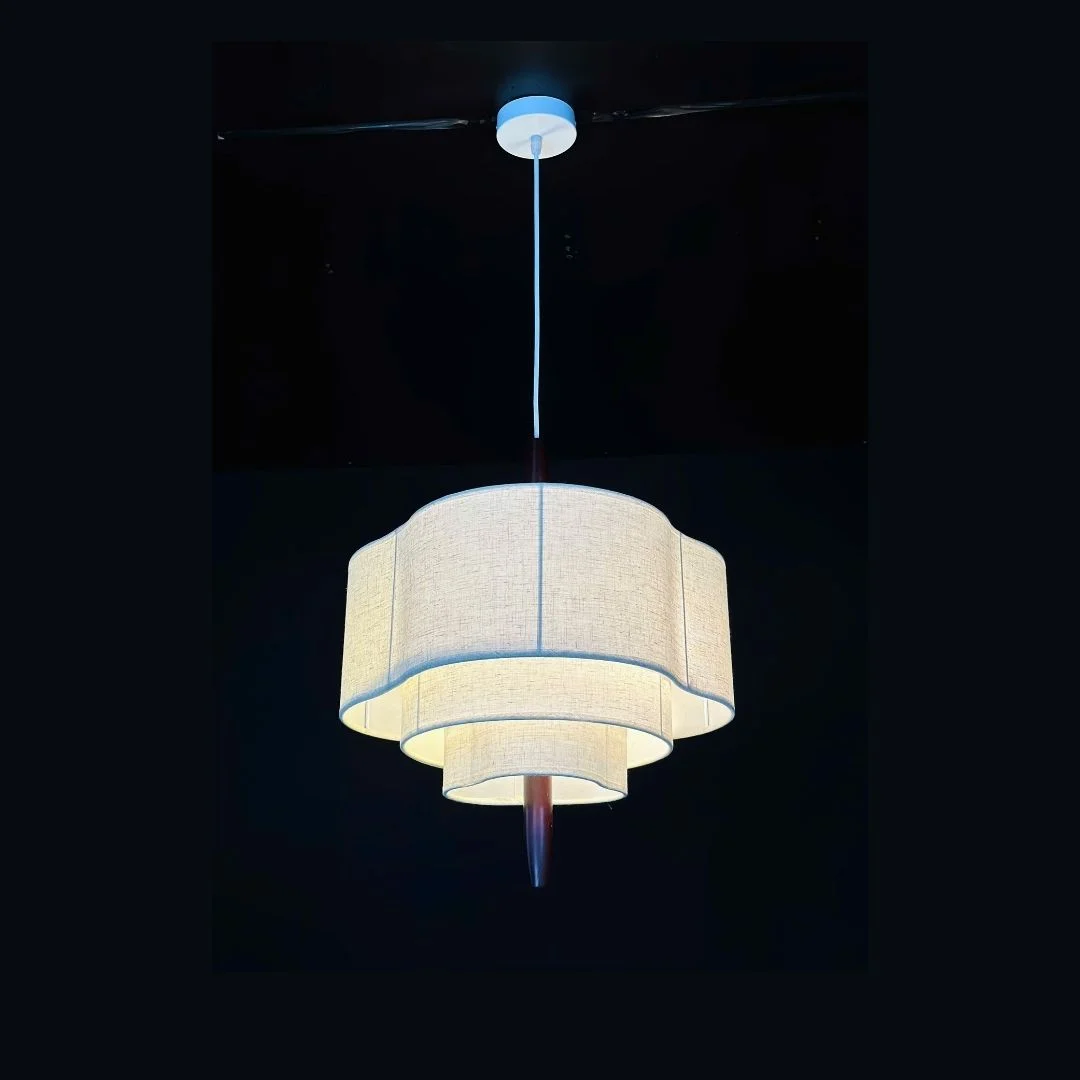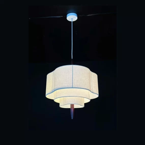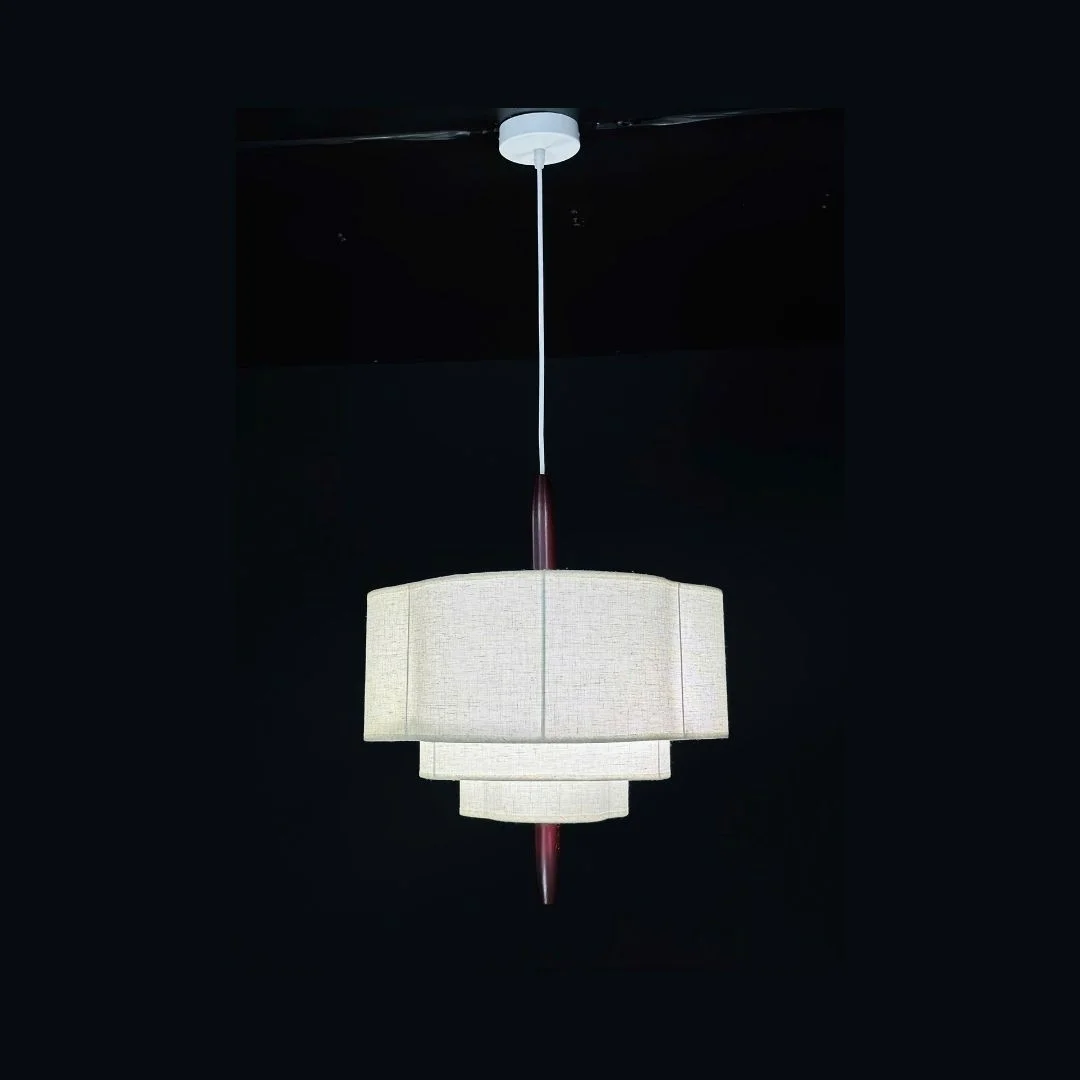 Đèn Thả Hiện Đại THD52 sử dụng cấu trúc chao vải nhiều tầng, các tầng xếp từ lớn đến nhỏ, tạo thành một khối trụ mềm nhưng không kém phần vững chãi. Khi bật đèn, ánh sáng đi xuyên qua từng lớp vải khiến chiếc đèn trông giống như một khối sáng nhiều lớp, rất bắt mắt. Ở trung tâm là thanh gỗ chạy dọc thân, liên kết giữa phần trên và dưới, làm cho thiết kế trông cao và thanh thoát. Mica bên trong được sử dụng để định hình, giữ cho chao vải luôn chuẩn form.