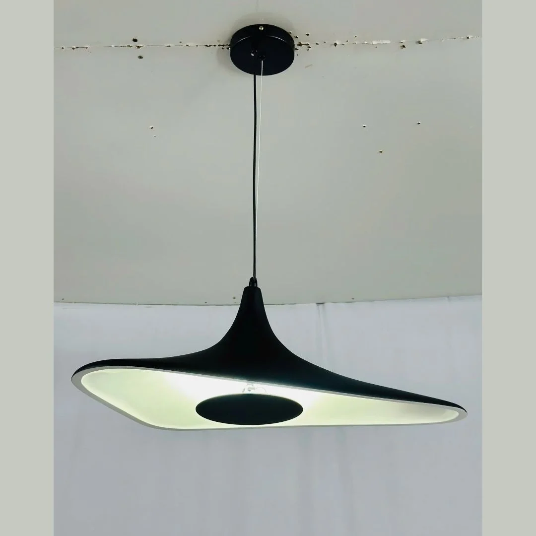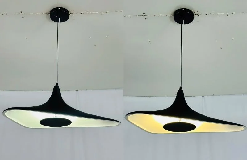 Đèn Thả Hiện Đại THD55 có phần thân dạng bản cong, nhìn như một dải kim loại đang xoải ngang không trung. Dây thả từ trần xuống gọn, không chiếm nhiều diện tích nhìn, khiến phần chao uốn cong càng nổi bật. Bề mặt ngoài sơn đen nhám, bên trong là tông sáng, nhờ vậy khi LED bật lên, ánh sáng hắt theo đường cong tạo hiệu ứng khá “mềm” trên bàn ăn hoặc mặt bàn phía dưới.