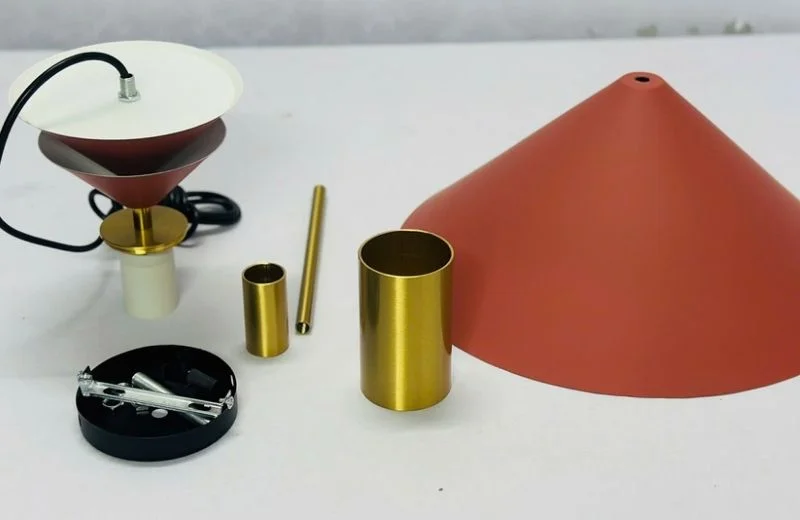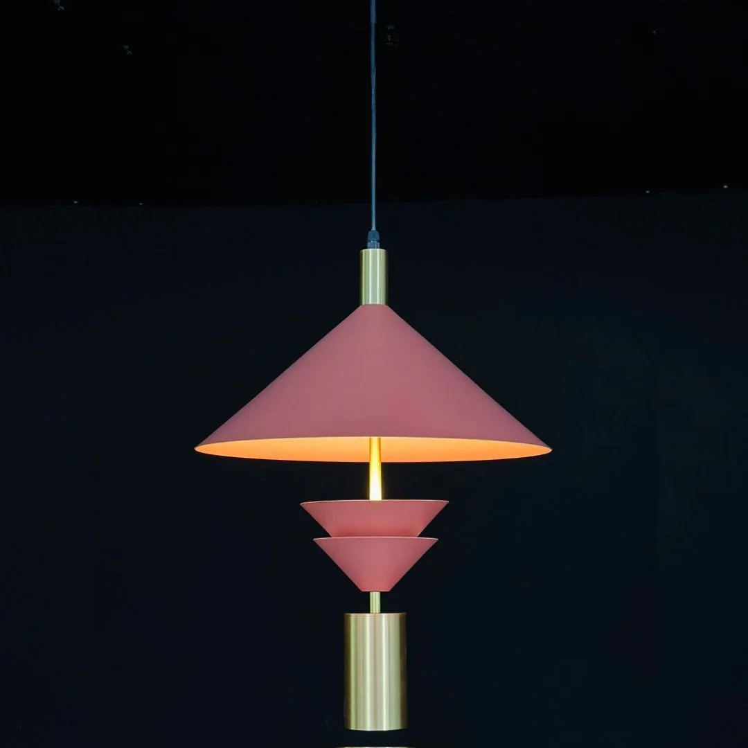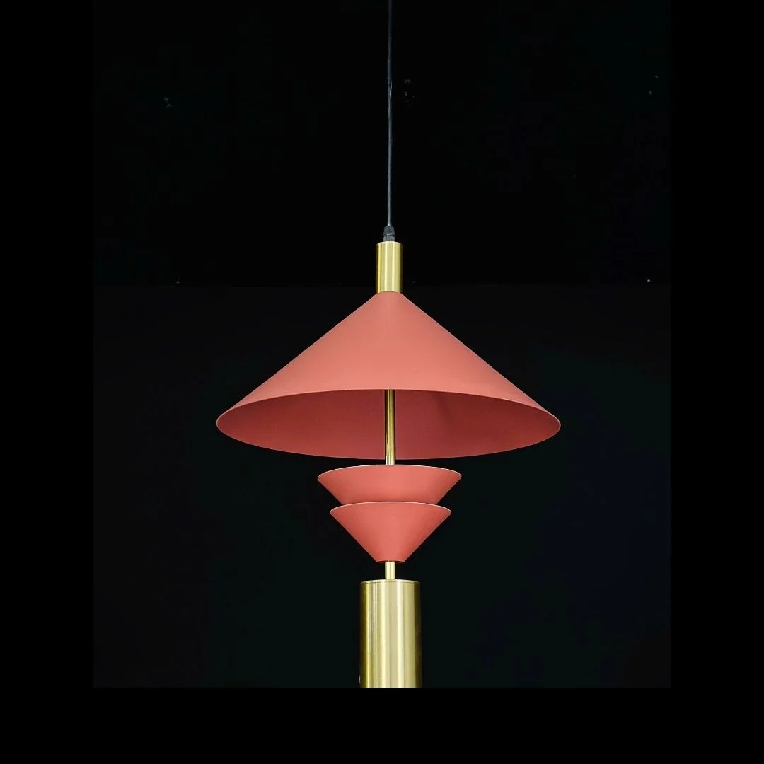 Đèn Thả Hiện Đại THD62 sử dụng các lớp chao hình nón xếp từ dưới lên trên, mỗi tầng thu nhỏ dần tạo thành khối tam giác mềm, trông vừa lạ mắt vừa cân đối. Phần thân trên là ống hợp kim nhỏ gọn nối với dây thả từ trần, tạo cảm giác chiếc đèn như đang được “treo” rất nhẹ nhàng. Tông màu cam đất kết hợp điểm nhấn kim loại vàng ở phần ống thân khiến chiếc đèn nổi bật nhưng không quá chói, phù hợp với nhiều kiểu nội thất.