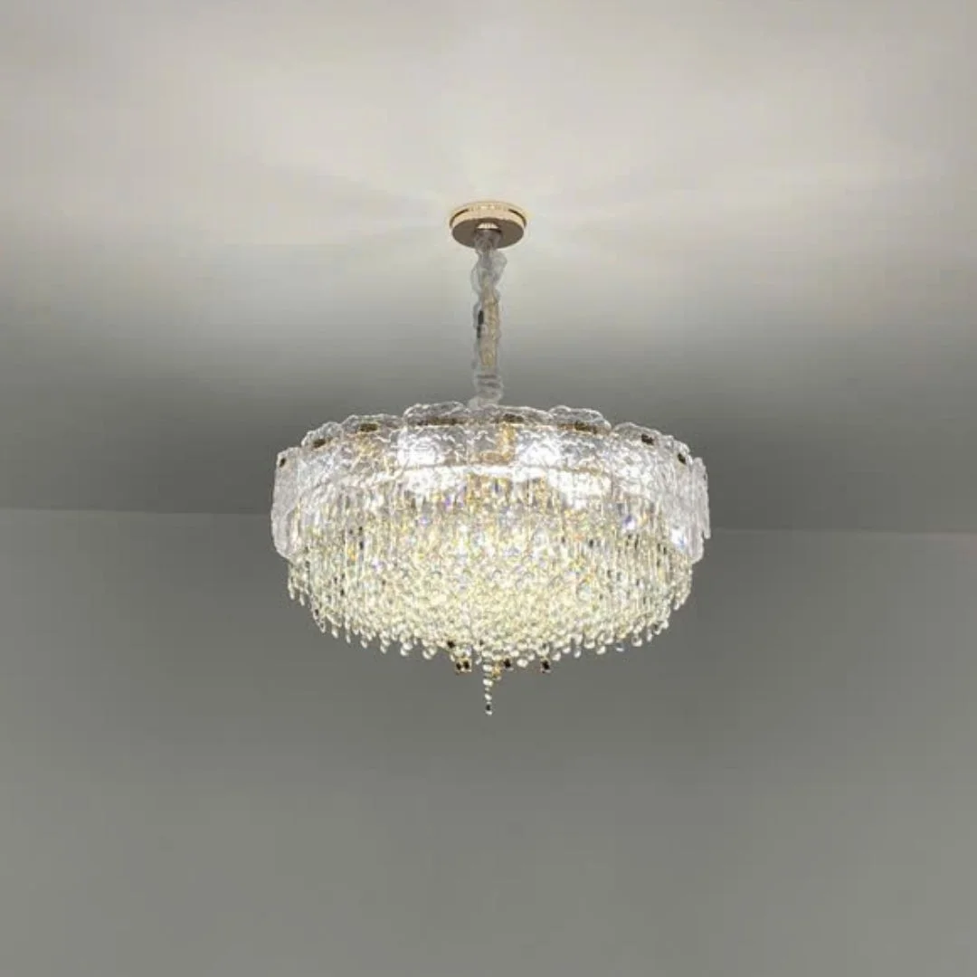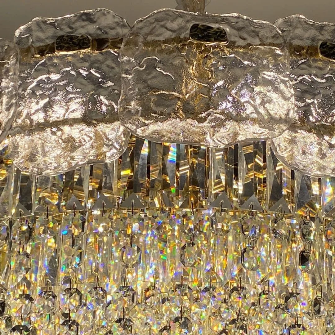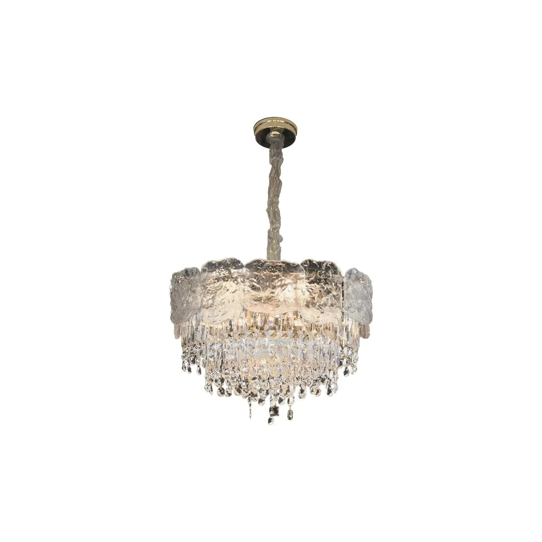 Đèn thả pha lê TPL011 gây ấn tượng bởi vành pha lê dạng khối băng bao quanh và chùm hạt rơi nhiều tầng ở trung tâm. Khi thắp sáng, các mặt cắt pha lê tạo hiệu ứng: