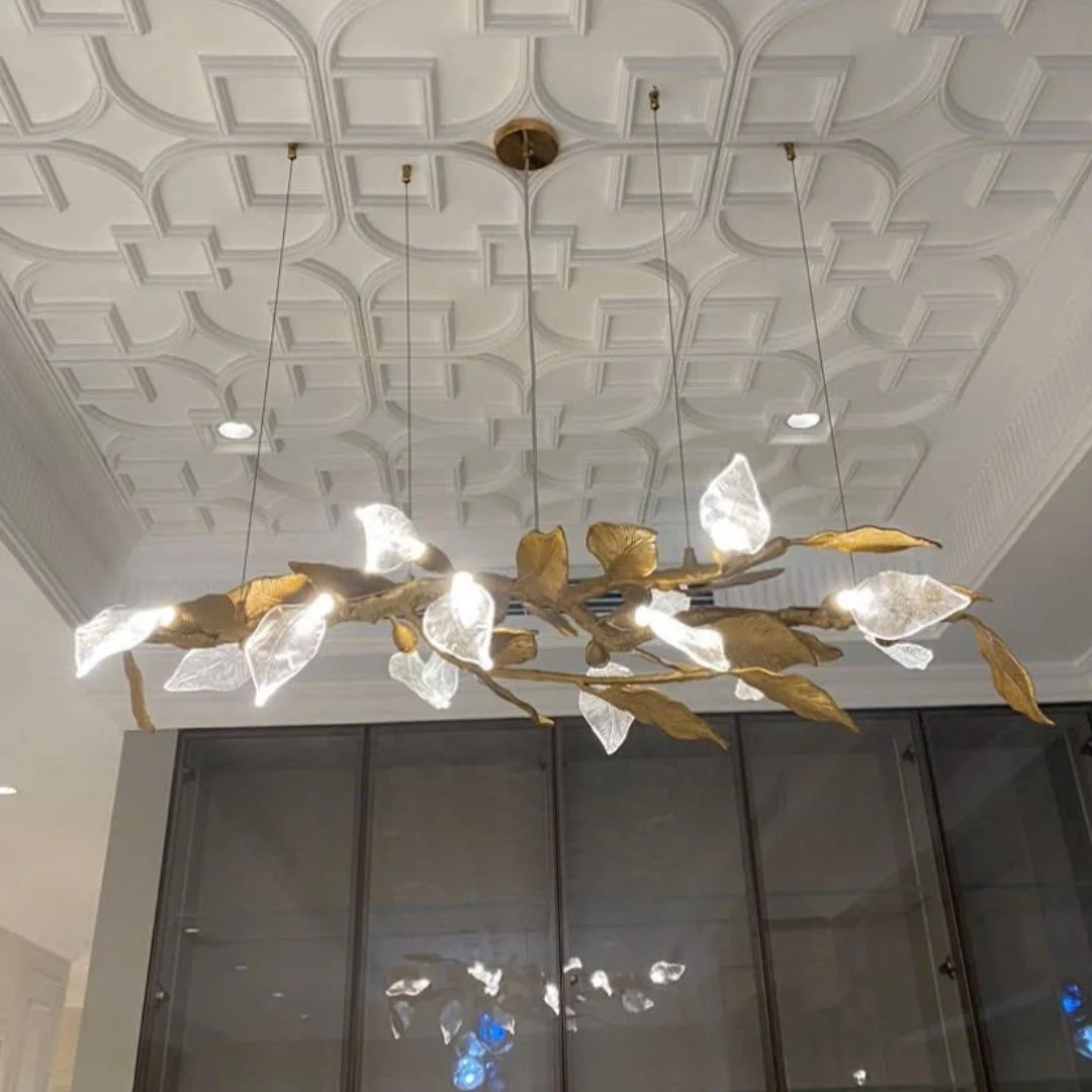 Đèn thả pha lê TPL2001N1200 có thiết kế dáng dài với phần thân mô phỏng những cành cây đan nhẹ vào nhau, tạo thành một đường nét uyển chuyển và thanh thoát. Trên thân đèn là những chiếc lá ánh kim kết hợp cùng các cụm sáng màu trắng, tạo cảm giác như hoa lá đang bừng sáng trong không gian. Tổng thể sản phẩm mang đến vẻ đẹp mềm mại, bay nhẹ nhưng vẫn đủ nổi bật để trở thành tâm điểm trong căn phòng. Khi lên đèn, ánh sáng vàng ấm lan tỏa qua các chi tiết trang trí giúp không gian trở nên dễ chịu, gần gũi và có chiều sâu hơn.