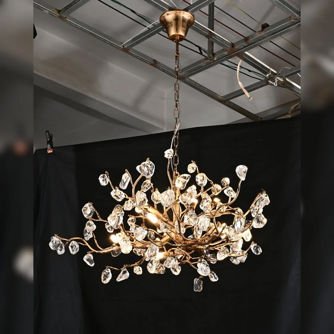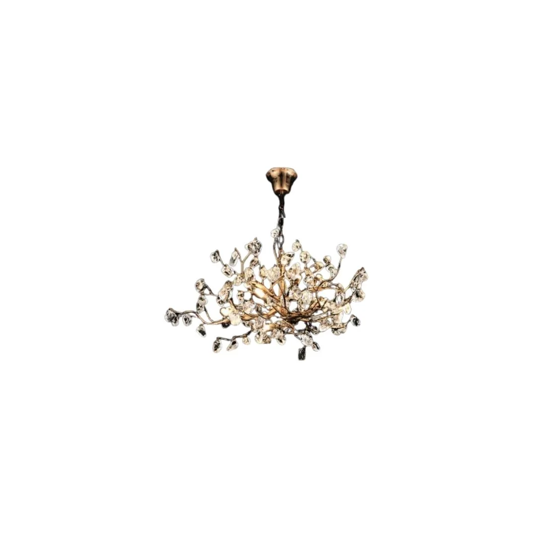 Đèn thả pha lê TPL2003 có thiết kế tròn với bố cục mở rộng từ tâm ra ngoài, tạo cảm giác như một chùm cành lá đang nở bung trong không gian. Các nhánh kim loại được uốn nhẹ và sắp xếp đan xen, giúp tổng thể chiếc đèn trở nên sinh động nhưng không rối mắt. Trên đầu mỗi nhánh là các viên pha lê trong suốt, góp phần làm mềm thiết kế và tăng hiệu ứng phản chiếu ánh sáng. Khi bật đèn, toàn bộ chiếc đèn mang lại vẻ lung linh rất cuốn hút, giúp căn phòng trở nên nổi bật hơn và giàu cảm xúc hơn.