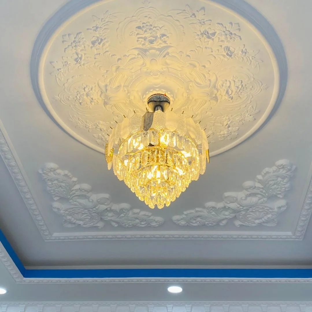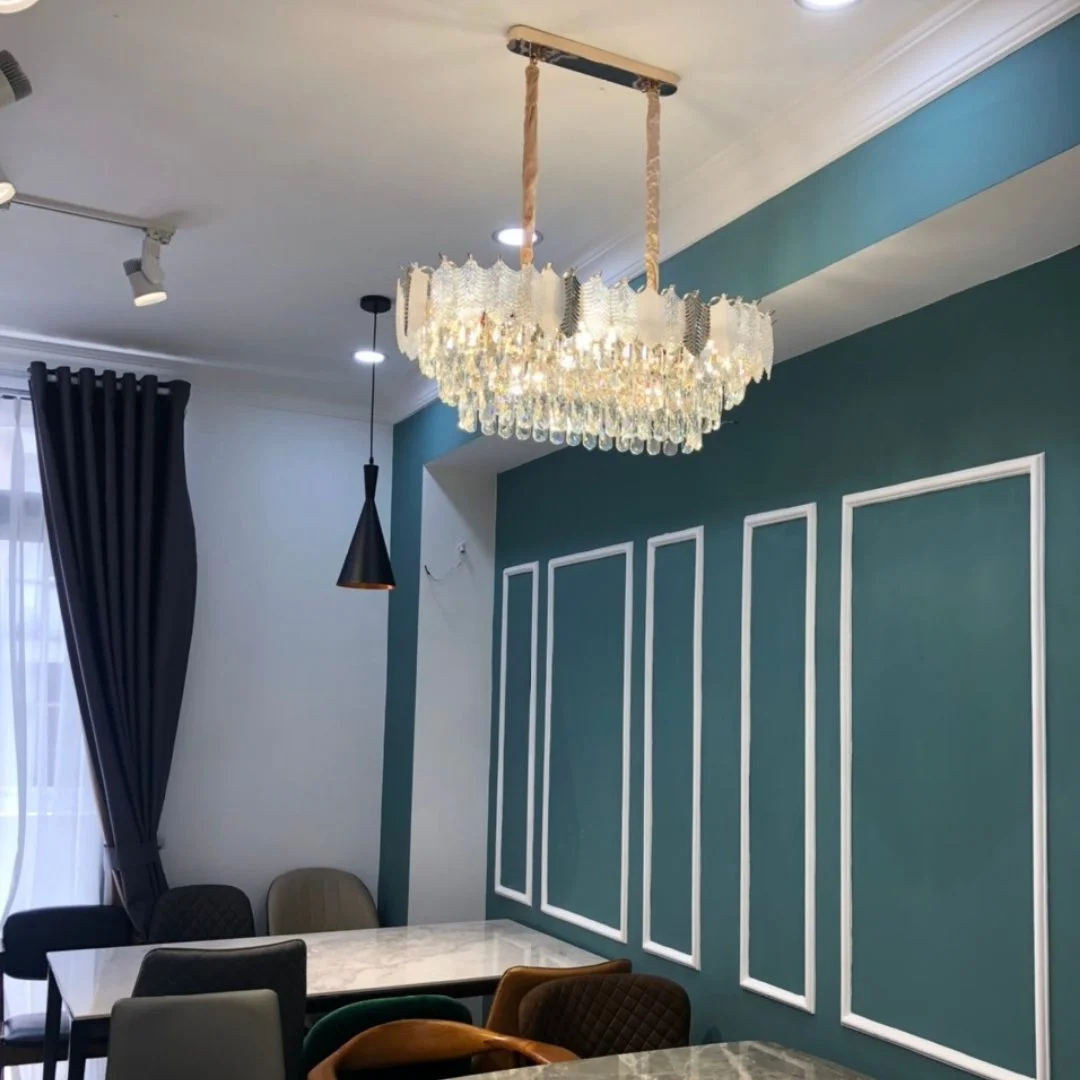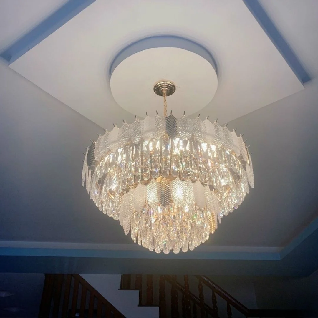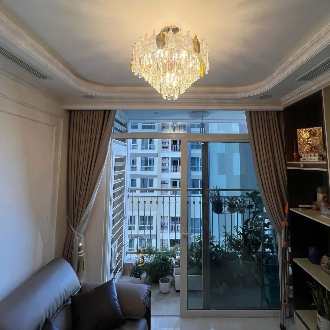 - Hiệu ứng ánh sáng qua pha lê mang lại sự ấm áp và sang trọng, đặc biệt phù hợp với khu vực sinh hoạt chung.