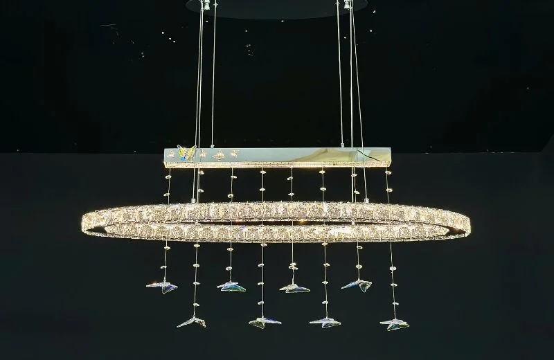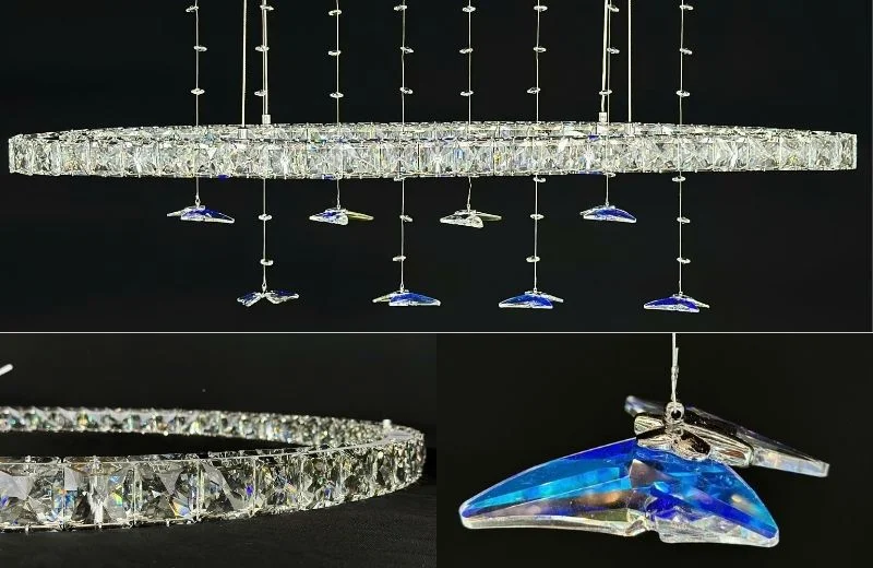 Chất liệu pha lê cao cấp giúp mỗi hạt đều có độ trong tốt, khi ánh sáng LED chiếu qua sẽ tạo hiệu ứng lấp lánh mà không bị chói. Khung kim loại sơn tĩnh điện giúp đèn có độ bền cao, ít bị oxy hóa, phù hợp với môi trường trong nhà, đặc biệt là khu vực bếp – bàn ăn thường có độ ẩm và khói nhẹ. Nhờ đó, sản phẩm giữ được vẻ ngoài như mới trong thời gian dài sử dụng.