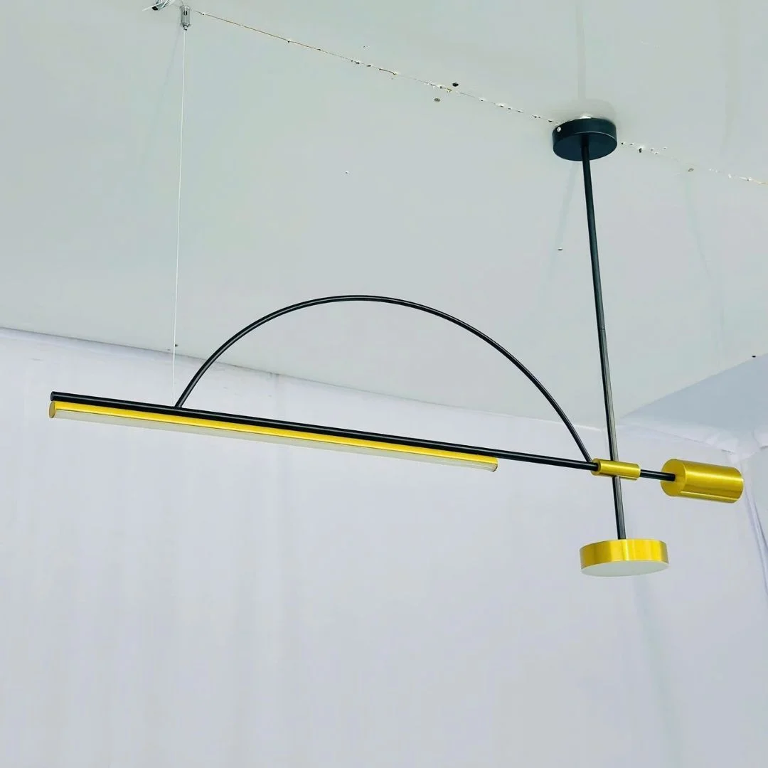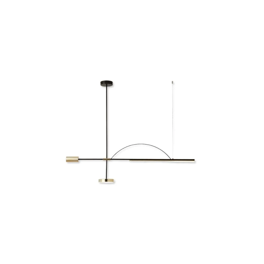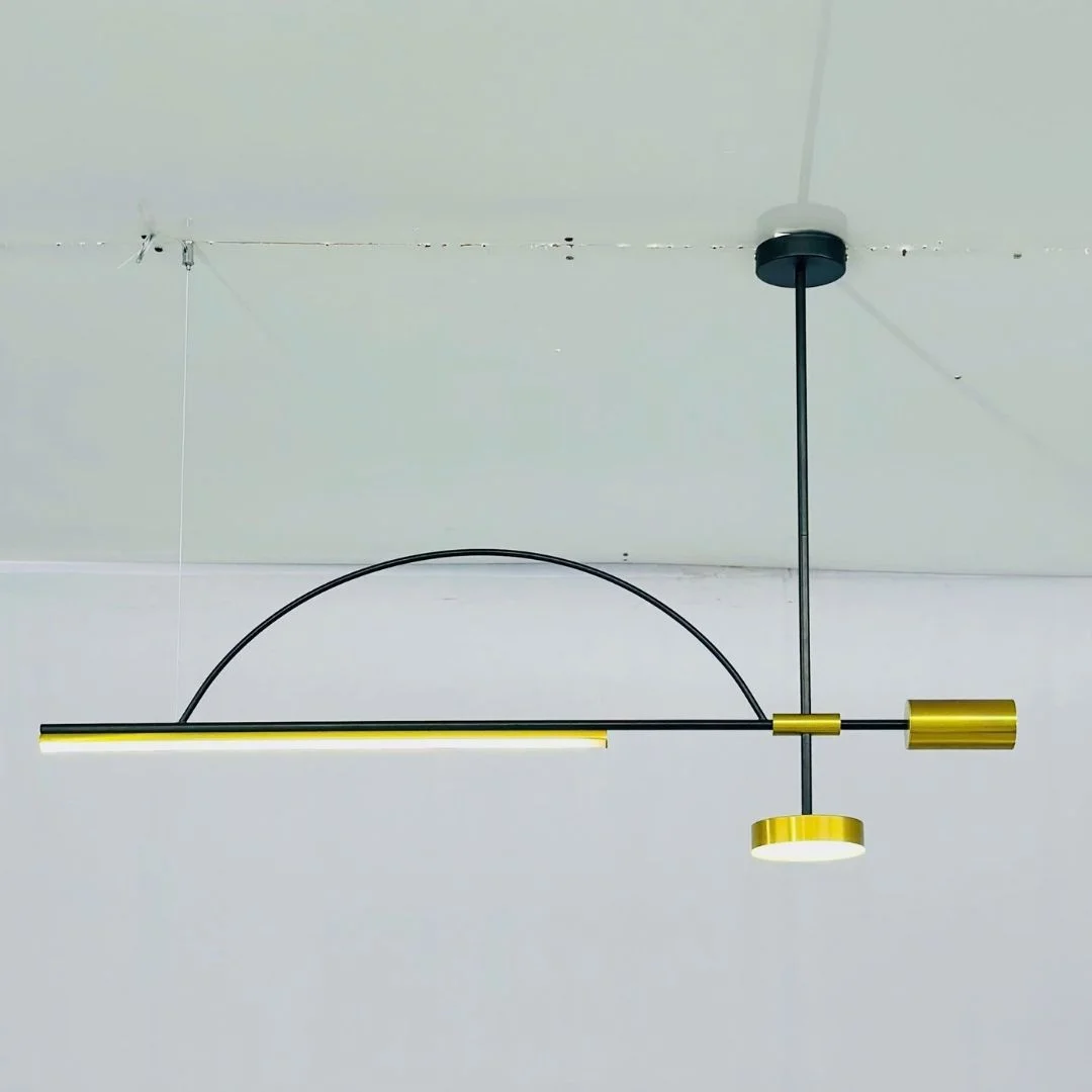 Điểm nổi bật của mẫu đèn này nằm ở cách tạo hình bất đối xứng đầy chủ đích. Một thanh đèn ngang dài được kết hợp với trụ đứng, vòng tròn nhỏ và đường cong vòm phía trên, tạo nên tổng thể vừa tối giản vừa giàu tính tạo hình. Chính bố cục này làm cho sản phẩm giống như một tác phẩm decor treo trần, giúp không gian bớt đơn điệu và có chiều sâu hơn về mặt thị giác. Dáng đèn thanh thoát, bố cục mở và màu sắc trung tính khiến mẫu đèn đặc biệt phù hợp với phong cách modern, minimalist, contemporary hoặc những không gian thích sự khác biệt nhưng vẫn cần giữ nét thanh lịch.