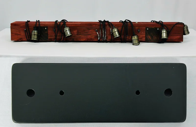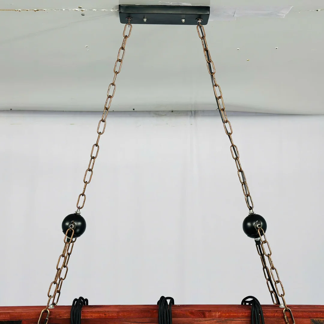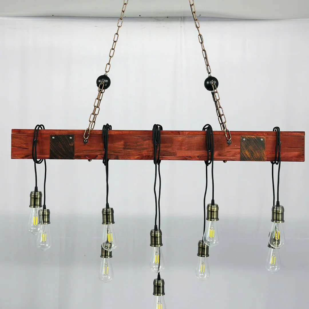 Đèn Thả Thiết Kế TTK38 được thiết kế theo dạng thanh treo dài tông gỗ nâu, kết hợp hệ xích treo phía trên tạo cảm giác chắc chắn và đúng tinh thần “công nghiệp”. Bên dưới là 10 dây thả đen rủ tự nhiên, mỗi dây gắn đui kim loại, giúp tổng thể vừa mộc mạc vừa mạnh mẽ. Khi lắp trên bàn ăn dài, ánh sáng được rải đều theo chiều dài thanh treo nên khu vực sinh hoạt trông sáng rõ và cân đối hơn.