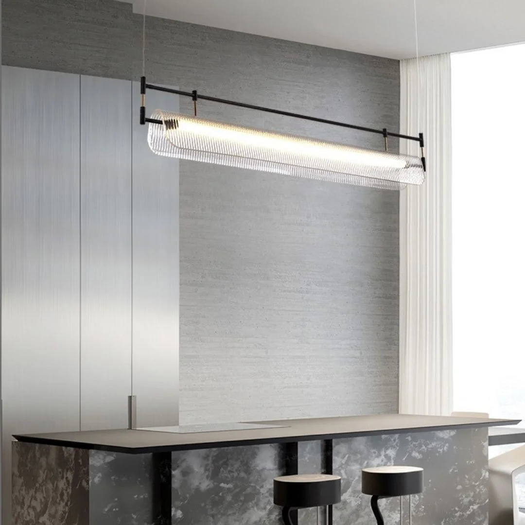 - Dáng đèn thanh dài giúp không gian có bố cục rõ ràng hơn, đặc biệt phù hợp với bàn ăn, quầy bếp và quầy bar.