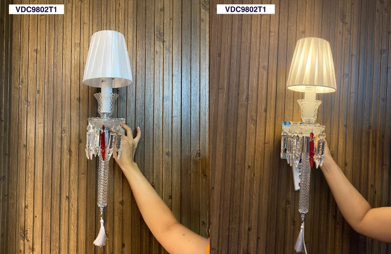 Đèn Tường Pha Lê VDC9802 có thiết kế khá đặc biệt so với nhiều mẫu đèn tường pha lê khác. Phần chao đèn được đặt phía trên cụm thân đèn, bên dưới là vòng pha lê trang trí và một dải tua dài rủ xuống, tạo cảm giác thanh thoát và mềm hơn cho mảng tường. Phiên bản T1 với một tay đèn phù hợp cho những khu vực cần sự gọn gàng. Phiên bản T2 với hai tay đèn đối xứng lại giúp tổng thể đầy đặn hơn và phù hợp với vị trí cần hiệu ứng trang trí mạnh hơn.