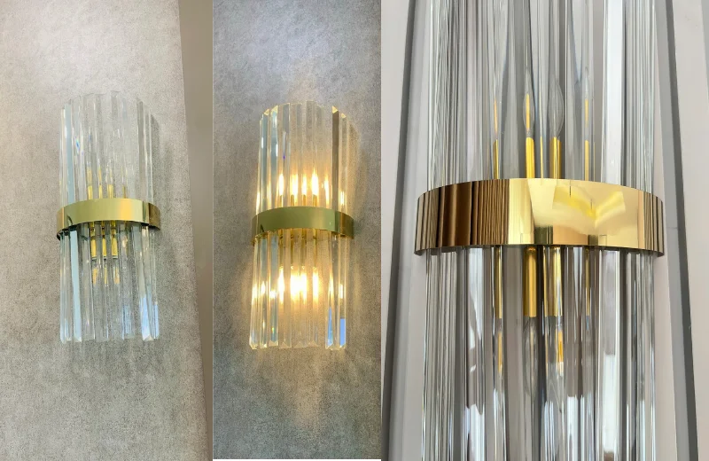 Đèn Tường Pha Lê VPL05 có thiết kế theo chiều dọc với tỷ lệ gọn gàng, rất phù hợp với các mảng tường vừa và nhỏ. Phần mặt ngoài là các thanh pha lê dựng thẳng, tạo nên bề mặt có chiều sâu và giúp chiếc đèn trông tinh tế hơn hẳn so với những mẫu đèn tường thông thường. Dải kim loại ở chính giữa đóng vai trò như điểm nhấn thị giác, giúp tổng thể cân đối và sang hơn.