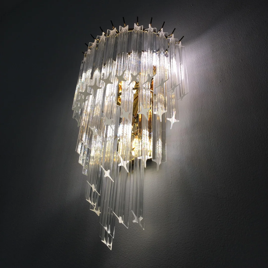 Sản phẩm được hoàn thiện từ pha lê và kim loại, trong đó phần pha lê đóng vai trò tạo hiệu ứng ánh sáng và tăng độ sang cho không gian. Khi lên đèn, ánh sáng xuyên qua từng lớp pha lê giúp chiếc đèn trở nên nổi bật và tạo chiều sâu đẹp trên bề mặt tường. Phần kim loại giữ kết cấu chắc chắn, đồng thời mang lại cảm giác ấm và cao cấp hơn cho tổng thể sản phẩm.