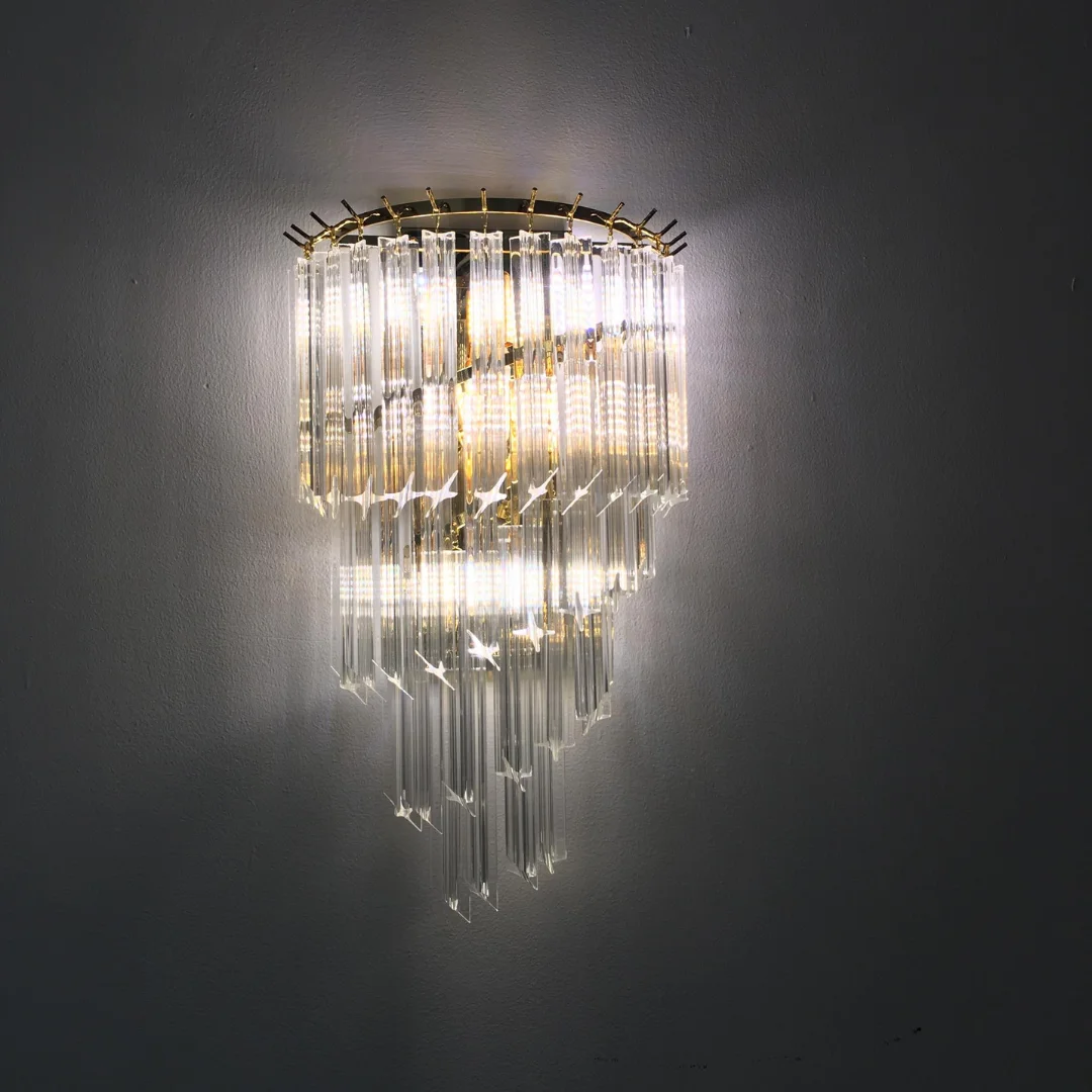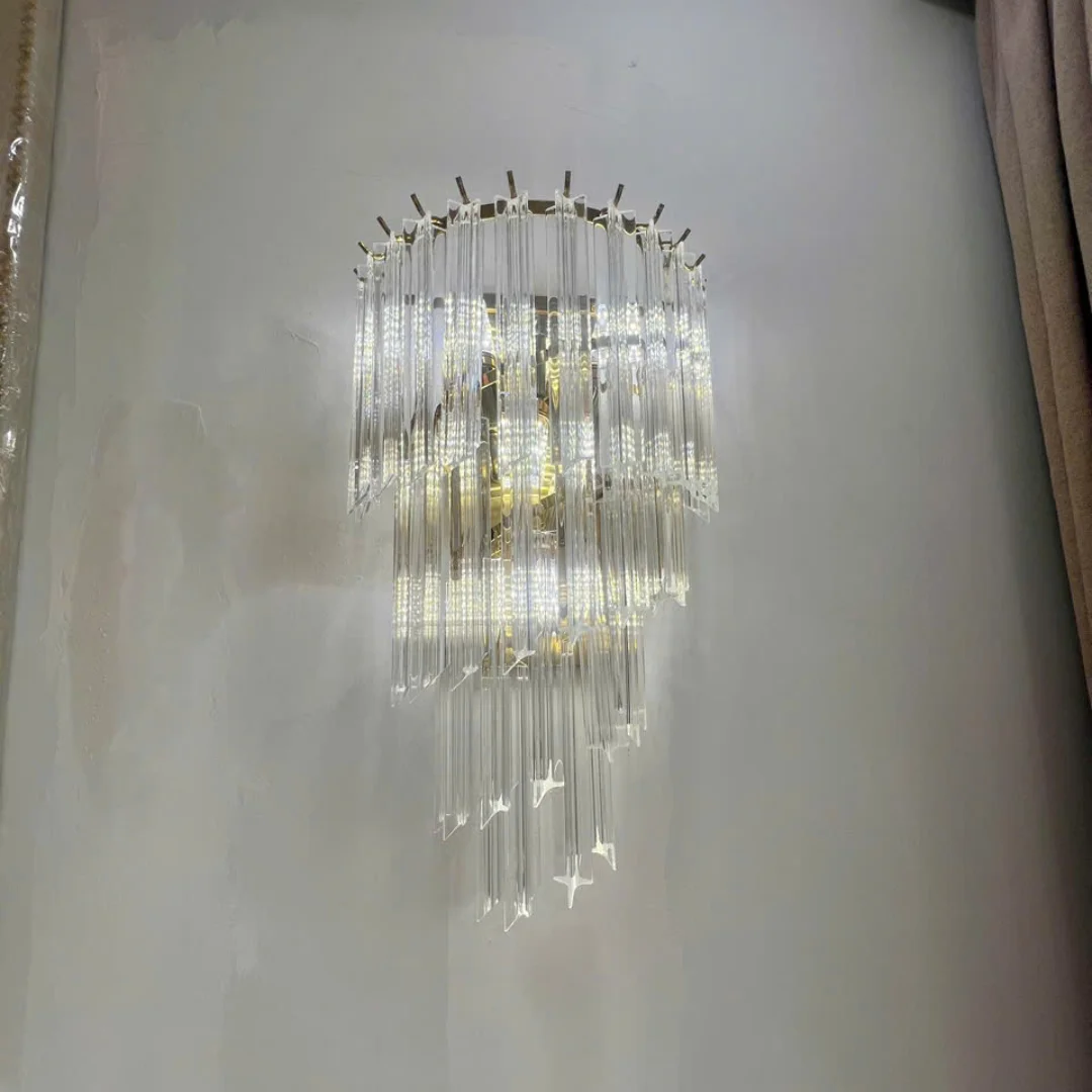 Đèn Tường Pha Lê VPL40 có thiết kế nổi bật với phần thân đèn mở rộng ở phía trên và rủ dần xuống phía dưới theo từng lớp, tạo nên tổng thể giống như một mảng sáng trang trí rất bắt mắt. So với các mẫu đèn tường gọn dạng trụ, VPL40 mang cảm giác mềm mại và có độ hiện diện cao hơn, vì vậy rất phù hợp với những bức tường cần được nhấn mạnh về mặt thẩm mỹ.