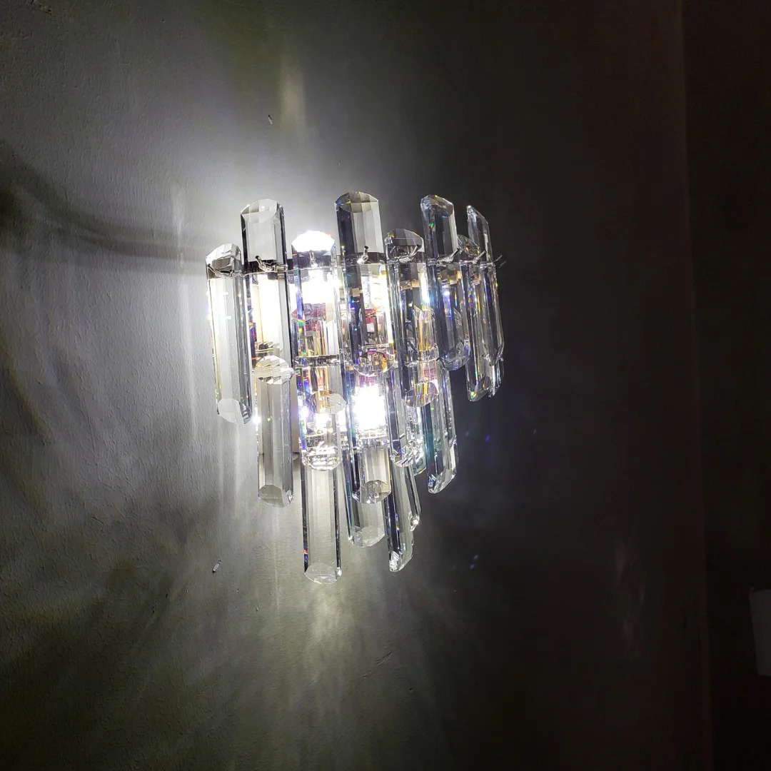 Sản phẩm được hoàn thiện từ pha lê K9 và thân xi cao cấp. Phần pha lê giúp ánh sáng tỏa ra đẹp hơn, phản xạ lung linh hơn và làm bức tường xung quanh sáng mềm hơn. Phần thân xi giữ cấu trúc ổn định, đồng thời tăng vẻ ngoài cao cấp và sáng đẹp cho sản phẩm. Nhờ sự kết hợp này, mẫu đèn vừa đáp ứng tốt nhu cầu trang trí, vừa bảo đảm độ bền và sự ổn định trong quá trình sử dụng lâu dài.