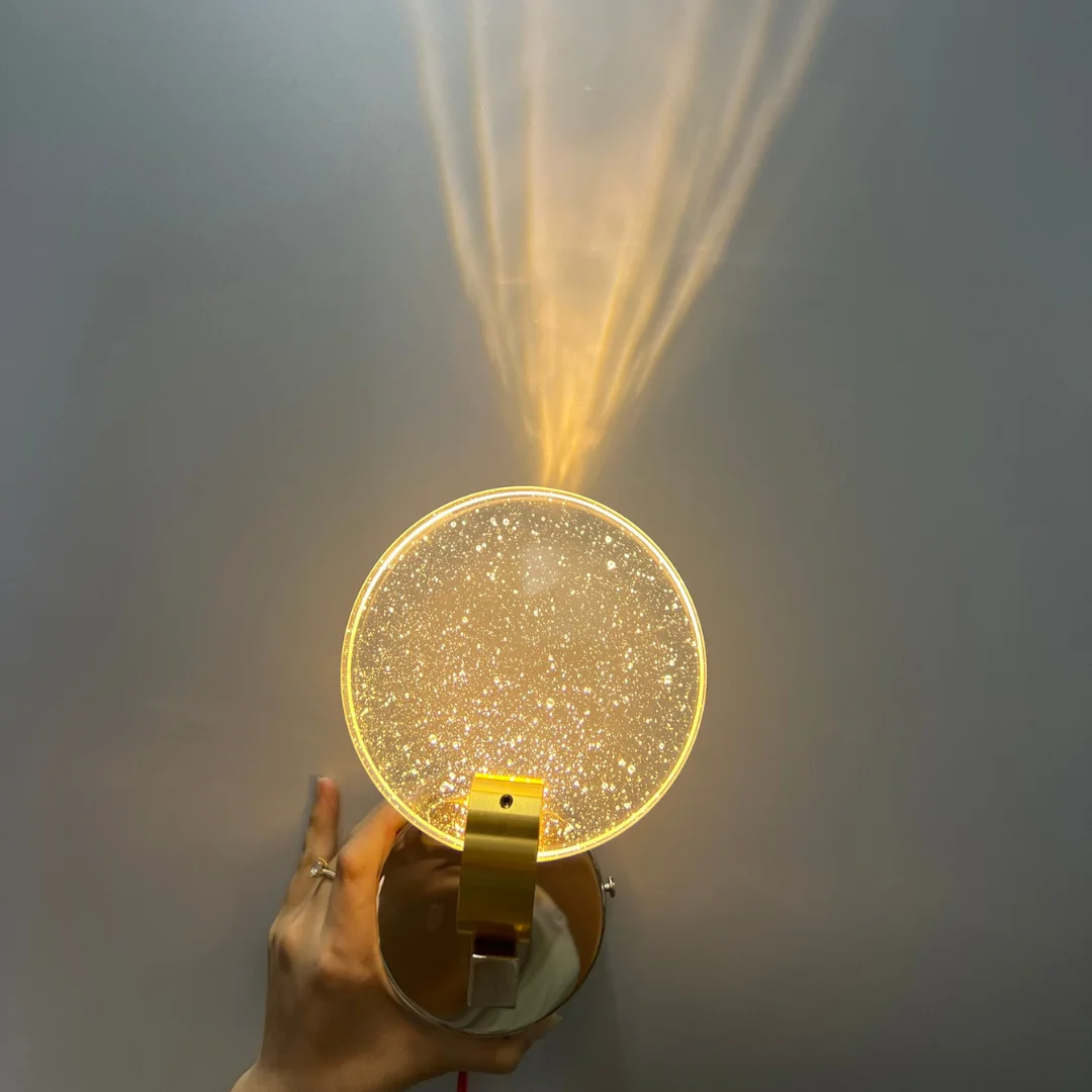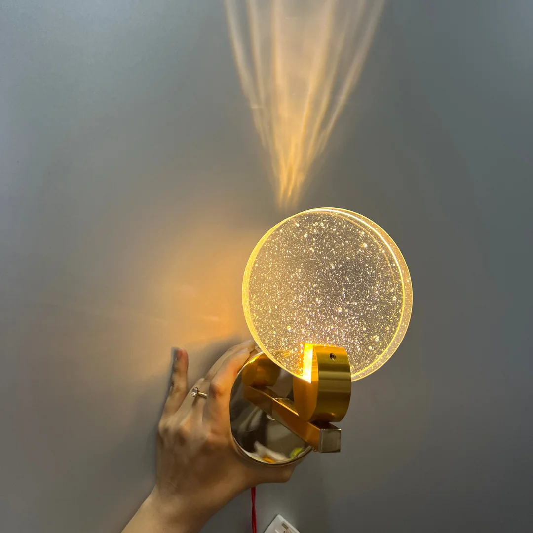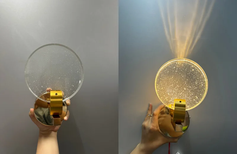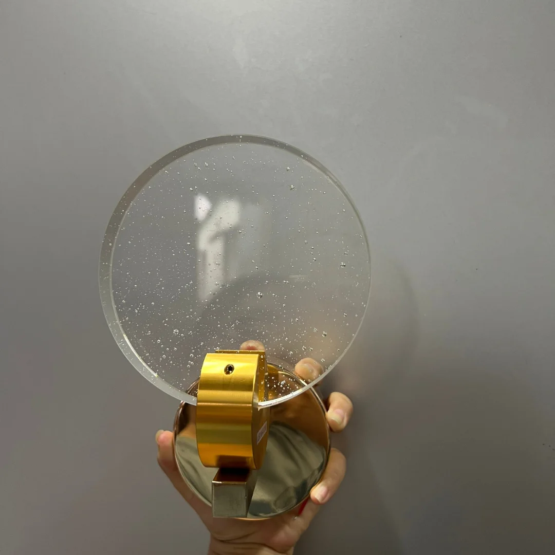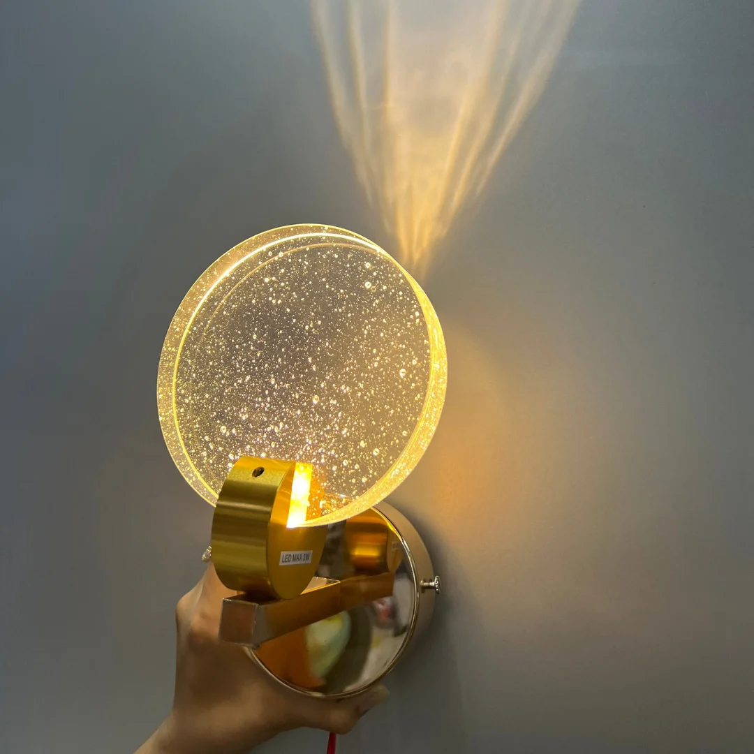 Phần mặt tròn mang vẻ đẹp của pha lê hoặc kính trang trí hiệu ứng pha lê, tạo cảm giác trong trẻo và có độ phản sáng nhẹ. Khi kết hợp với LED 3000K, ánh sáng phát ra sẽ thiên về tông vàng ấm, giúp không gian trở nên dễ chịu hơn, đặc biệt phù hợp cho phòng ngủ, khu vực thư giãn hoặc nơi tiếp khách cần cảm giác gần gũi. Phần đế kim loại màu vàng đồng đóng vai trò như một chi tiết tăng độ sang cho sản phẩm. Nhờ màu sắc này, chiếc đèn không bị lạnh hay công nghiệp, mà trở nên mềm và dễ hòa hợp hơn với đồ nội thất gỗ, nỉ, đá hoặc kính trong nhà.