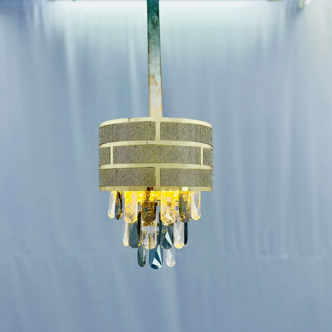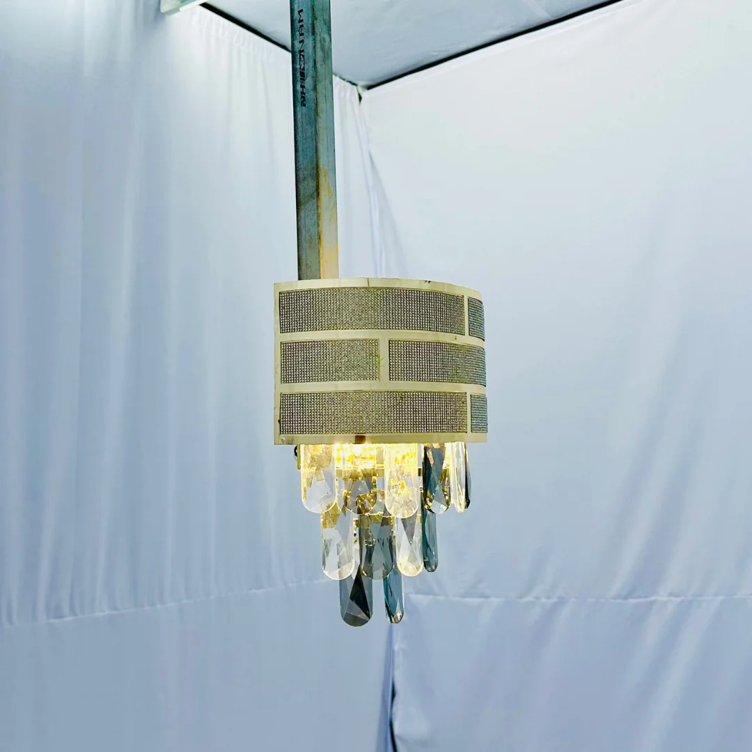 Sản phẩm được hoàn thiện từ pha lê và khung kim loại, trong đó phần pha lê giúp ánh sáng tỏa ra đẹp hơn và tạo hiệu ứng phản chiếu tinh tế cho khu vực lắp đặt. Phần khung kim loại tông vàng giúp giữ cấu trúc đèn ổn định, đồng thời tăng cảm giác sang trọng cho tổng thể. Sự kết hợp này giúp mẫu đèn vừa đáp ứng nhu cầu làm đẹp không gian, vừa phù hợp với việc sử dụng ổn định trong nhà ở.