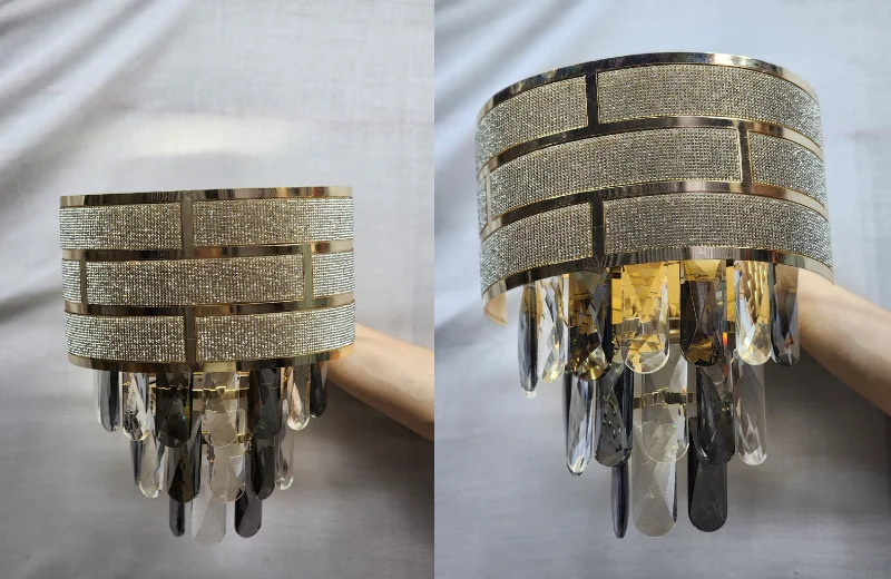 Đèn Tường Pha Lê VPL88461 có kiểu dáng khá đầy đặn với phần thân trên chắc khỏe, được chia thành các đai ngang rõ ràng, bên dưới là cụm pha lê rủ tạo nên sự mềm mại và cân đối. Nhờ bố cục này, chiếc đèn vừa có cảm giác hiện đại, vừa không bị khô cứng. Đây là kiểu thiết kế rất phù hợp với những bức tường cần một điểm nhấn nổi bật nhưng vẫn muốn giữ sự thanh lịch.