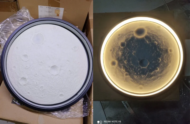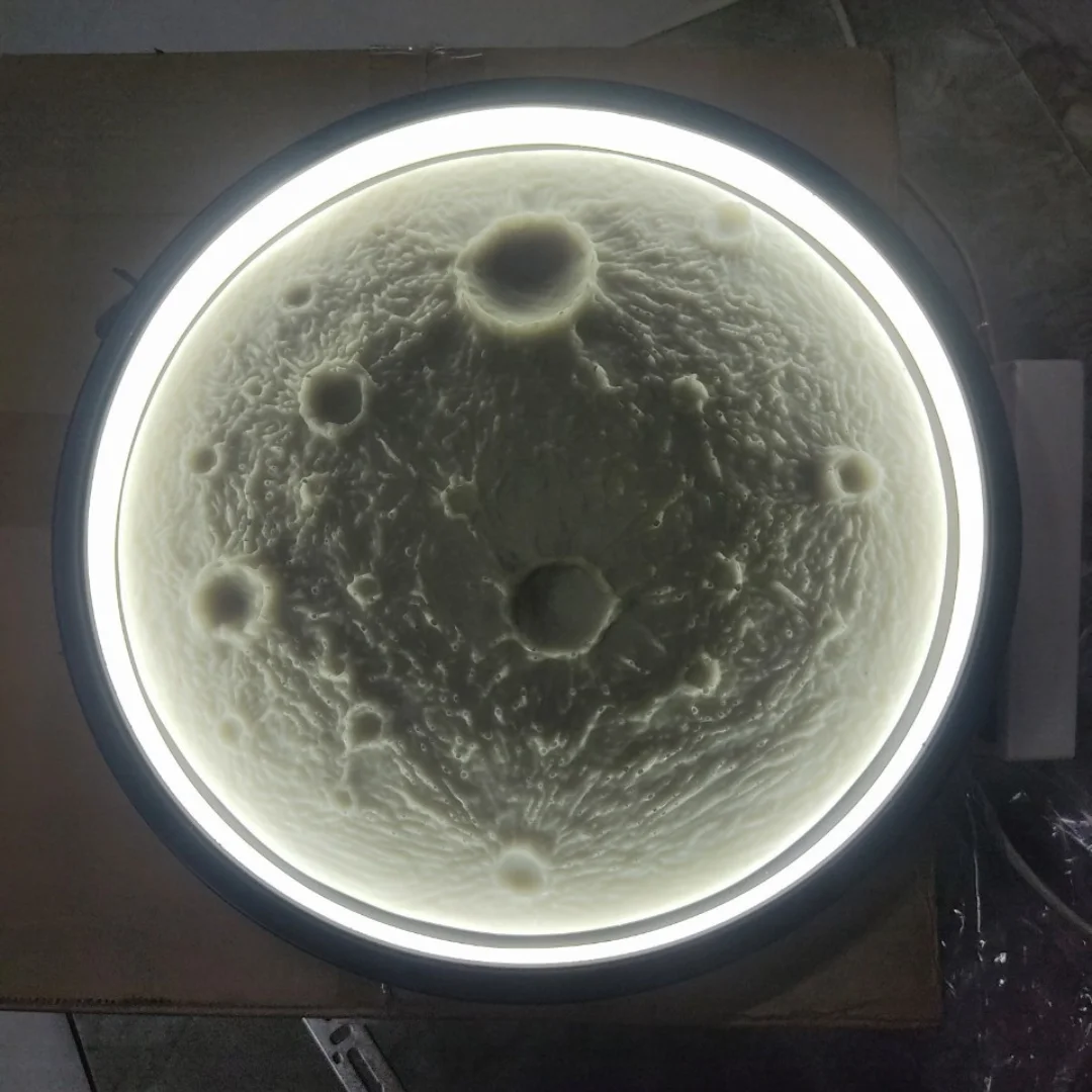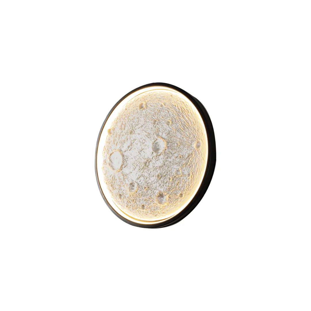 Đèn Tường Thiết Kế VK125T300 có thiết kế hình tròn bản lớn với cảm hứng rõ rệt từ bề mặt mặt trăng. Toàn bộ phần mặt đèn được xử lý nổi khối với nhiều chi tiết gồ ghề, hốc lõm và đường vân tự nhiên, tạo cảm giác chân thực và có chiều sâu rất rõ. Nhờ thiết kế này, sản phẩm không chỉ là một chiếc đèn mà còn giống như một món decor treo tường mang tính nghệ thuật cao.