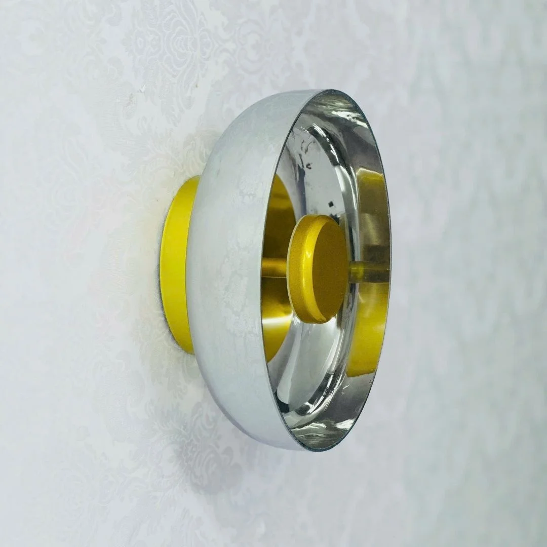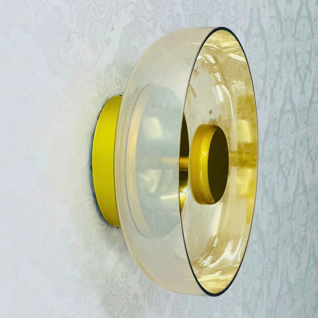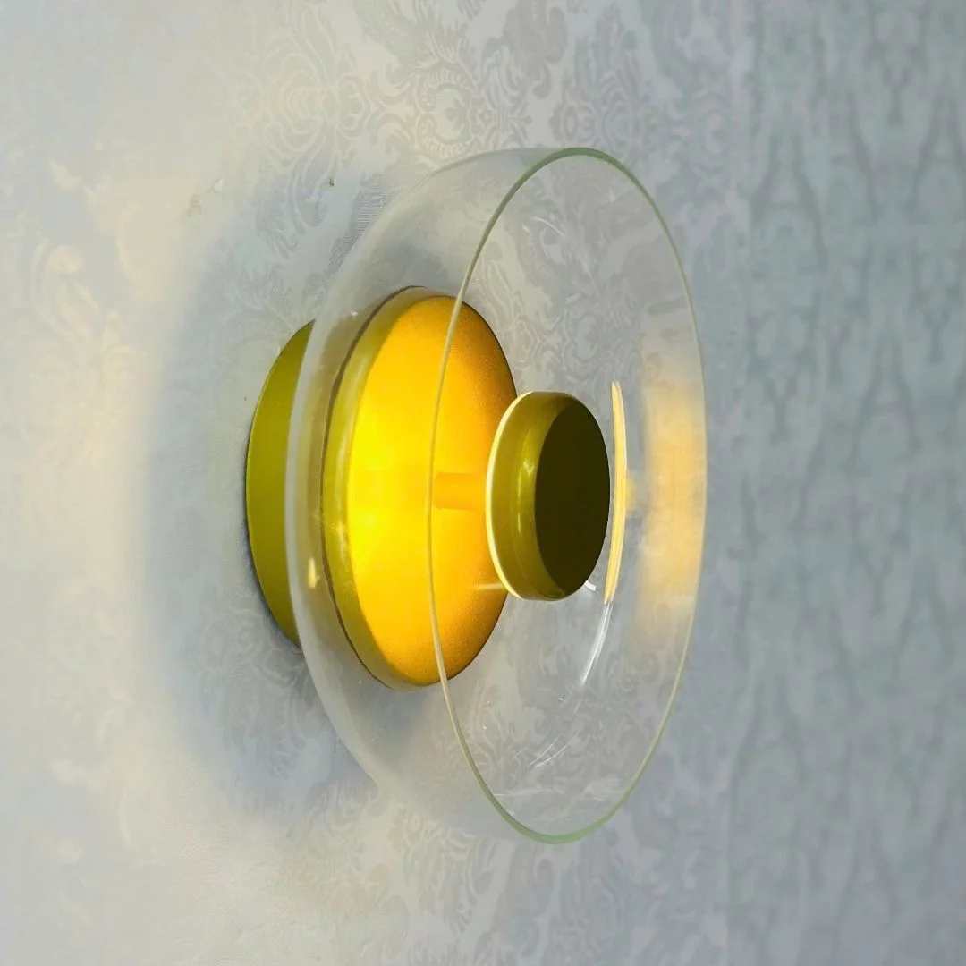 Đèn Tường VK50 được thiết kế dạng đĩa tròn, phần trung tâm là khối tròn nhỏ màu vàng kim tạo cảm giác như một “mặt trời” thu nhỏ. Lớp kính bao quanh trong suốt, khói hoặc trà giúp ánh sáng vàng 3000K lan ra thành những vòng sáng mềm, không chói gắt, rất thích hợp để tạo điểm nhấn trên mảng tường trơn. Nhìn ngang, đèn có độ dày vừa phải (W90 mm), bám sát tường nên tổng thể gọn gàng, không chiếm nhiều diện tích.