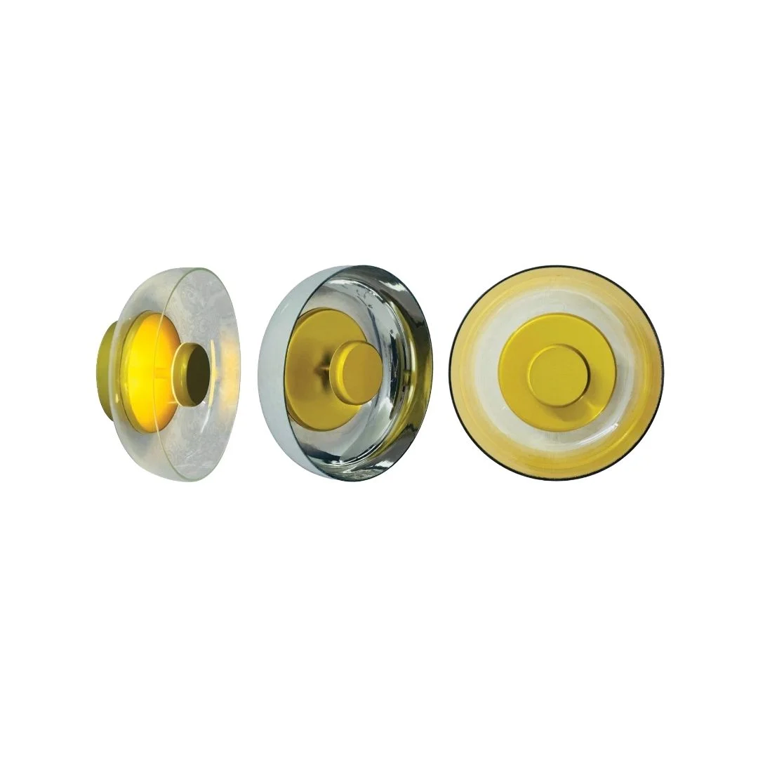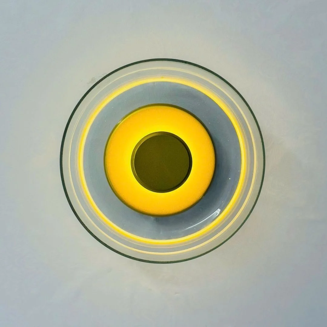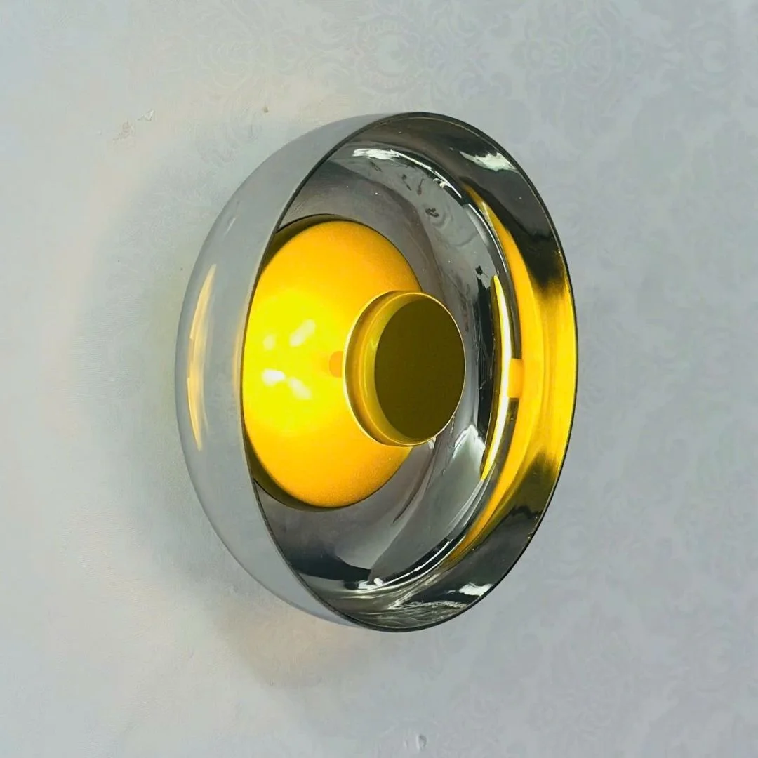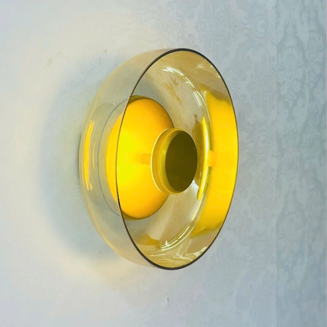Đèn Tường VK50 được thiết kế dạng đĩa tròn, phần trung tâm là khối tròn nhỏ màu vàng kim tạo cảm giác như một “mặt trời” thu nhỏ. Lớp kính bao quanh trong suốt, khói hoặc trà giúp ánh sáng vàng 3000K lan ra thành những vòng sáng mềm, không chói gắt, rất thích hợp để tạo điểm nhấn trên mảng tường trơn. Nhìn ngang, đèn có độ dày vừa phải (W90 mm), bám sát tường nên tổng thể gọn gàng, không chiếm nhiều diện tích.