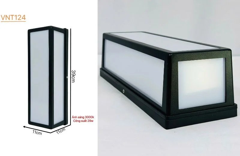 Đèn Tường VNT124 được thiết kế dạng khối hộp đứng, mặt phẳng, cạnh sắc nét, tạo nên vẻ ngoài hiện đại và gọn gàng khi gắn lên tường. Nhờ tỷ lệ thân đèn cao, thon, khi lắp theo hàng dọc trên tường sẽ tạo nên nhịp sáng rất đẹp mắt, đặc biệt ở các mảng tường dài như hành lang hay tường rào. Bề mặt phát sáng lớn trên bốn cạnh giúp ánh sáng LED bên trong tỏa đều, tạo một lớp sáng mềm bao quanh đèn, không gây chói nhưng vẫn đủ nổi bật.