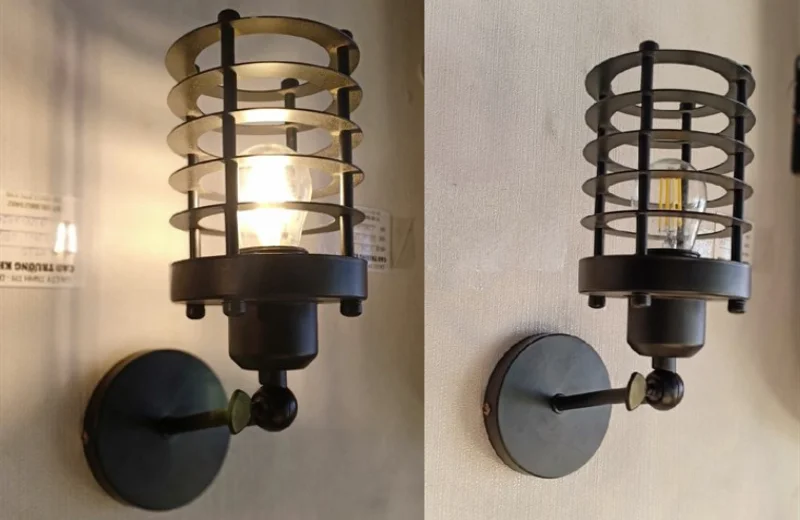 Về chất liệu, sản phẩm mang đặc trưng của dòng đèn tường decor với thân kim loại sơn đen kết hợp chụp kính trong bảo vệ nguồn sáng. Kiểu cấu tạo này phù hợp vì giúp đèn chắc chắn, sử dụng bền lâu và đồng thời tăng hiệu quả hiển thị ánh sáng. Khung sắt ngoài cũng góp phần tạo chiều sâu cho thiết kế, giúp chiếc đèn nhỏ nhưng vẫn có điểm nhấn rõ rệt.