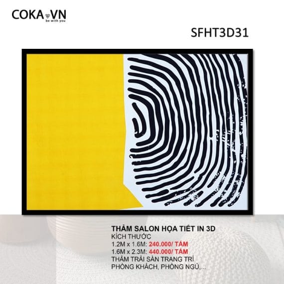 - Thảm Sofa Trang trí họa tiết in 3D được thiết kế theo phong cách đơn giản, hiện đại, dễ vệ sinh. Do đó, dòng sản phẩm này vẫn thể hiện vẻ đẹp sang trọng, quý phái của nó. Thảm Salon hay còn gọi là Thảm Sofa thích hợp với nhiều không gian đặc biệt là phòng khách, phòng ngủ.